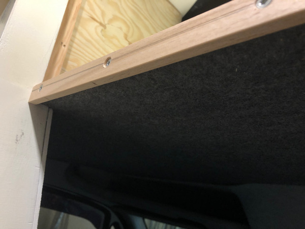 An der Stirnseite des Ablagefaches über der Fahrerkabine, sowie auf der Küchenarbeitsplatte, darunter wurden Lärchenleisten auf 18*12 mm zurechtgehobelt und aufgeschraubt,