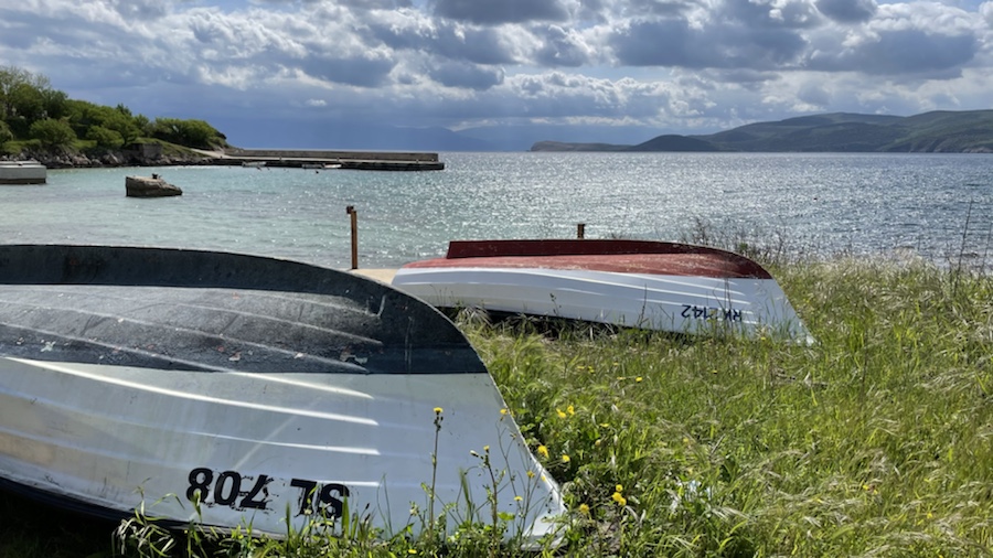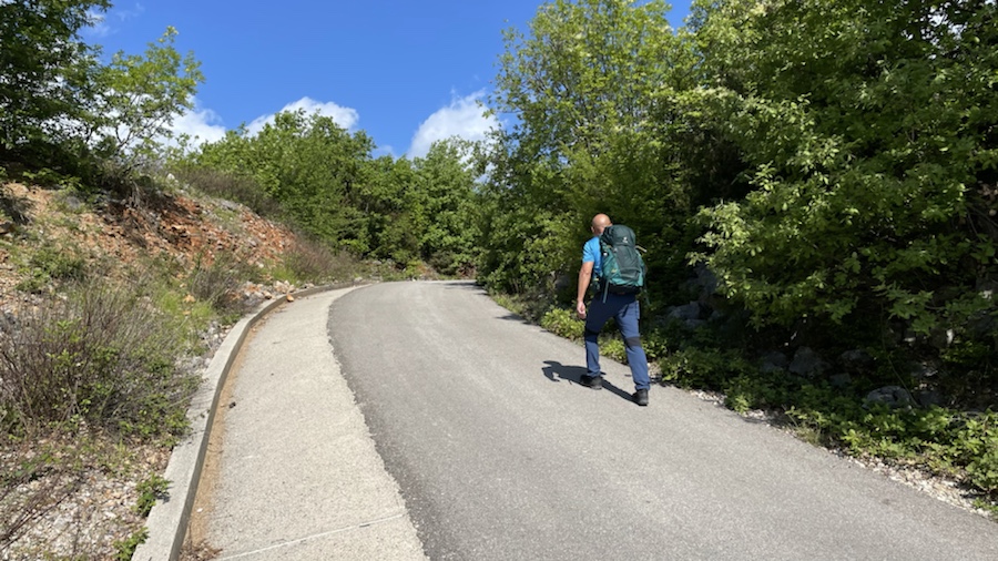 Vom örtlichen Busbahnhof gehen wir zuerst zur gegenüberliegenden Bucht. Danach geht es stetig, aber sanft bergauf, leider nur asphaltiert.