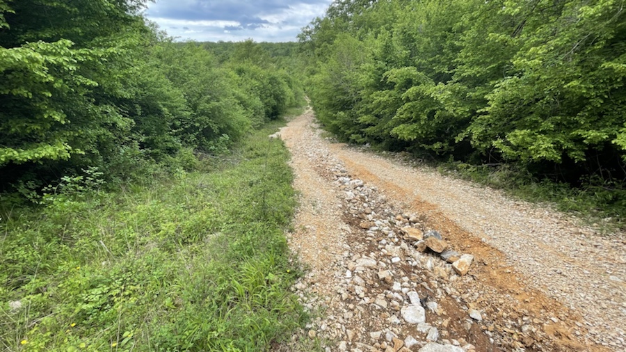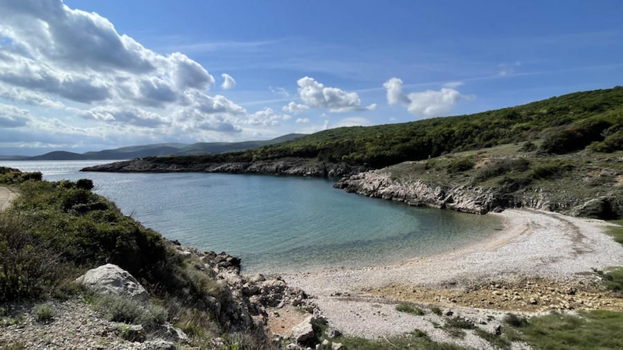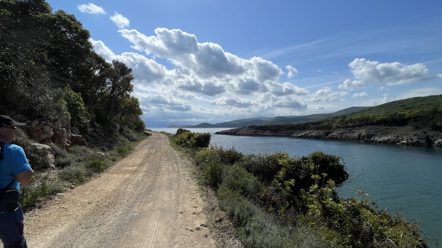Am Höhenrücken vom Uvala Kostrijcica wird aus Asphalt eine Schotterstraße, die sich bis zum Strand bei Sveti Marak zieht.