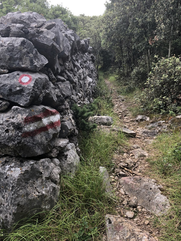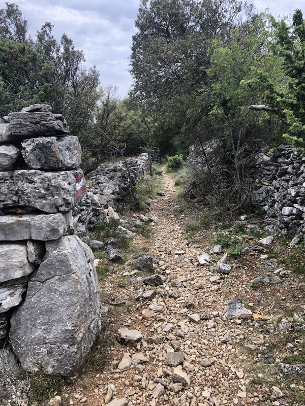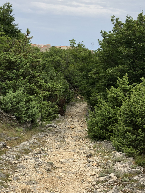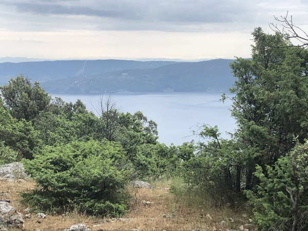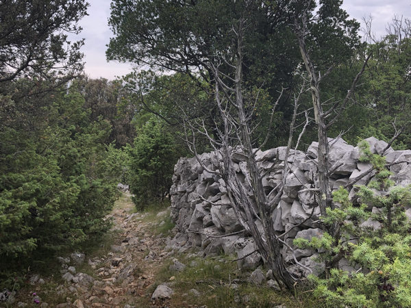 Gleich zu Beginn geht es zügig und kontinuierlich im Wald bergauf und ich entferne mich mit jedem Schritt von Valun. Leider gibt der Wald von hier aus keinen Blick auf diesen netten kleinen Ort frei. Nach der Waldetappe beginnt ein ziemlich ausgetretener Pfad in Richtung Zbicina, einem kleinen und kaum bewohnten Örtchen (letzte Volkszählung 2001 ergab !!! 13 Einwohner !!!) hier am Berghang.