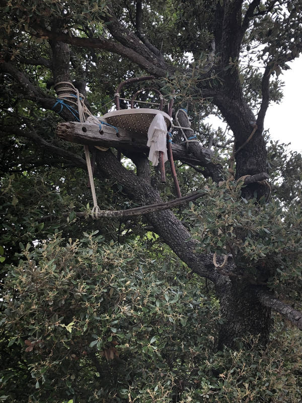 Nach der nächsten Biegung fällt mir ein eher dubioser Jägerstand auf. Mitten im Baum wurde ein ehemaliger ausrangierter Gartenstuhl mit primitivsten Mitteln befestigt.