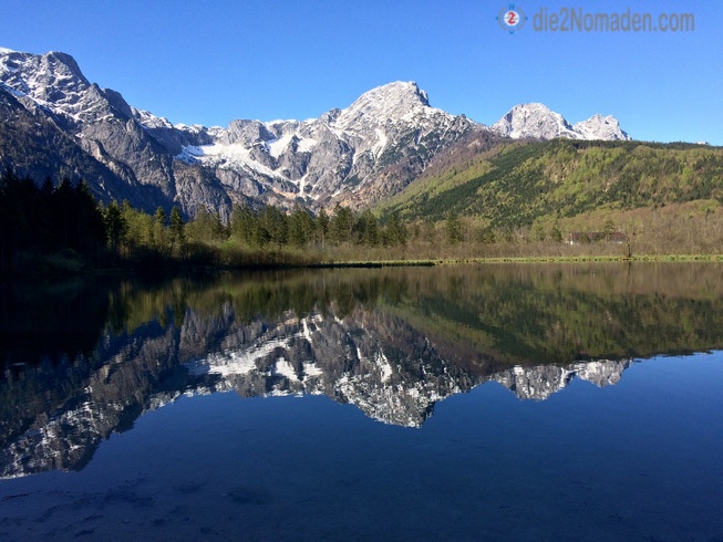 Im Almsee tummeln sich früh morgens schon die Entlein und im spiegelglatten See werfen die schneebedeckten Berge ihre Schattenbilder.