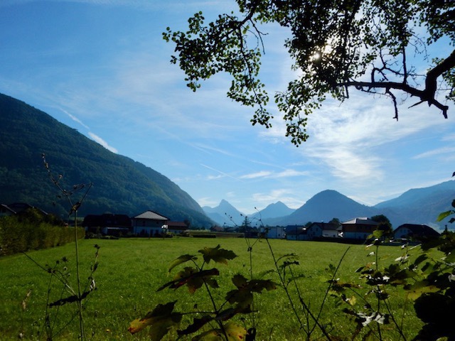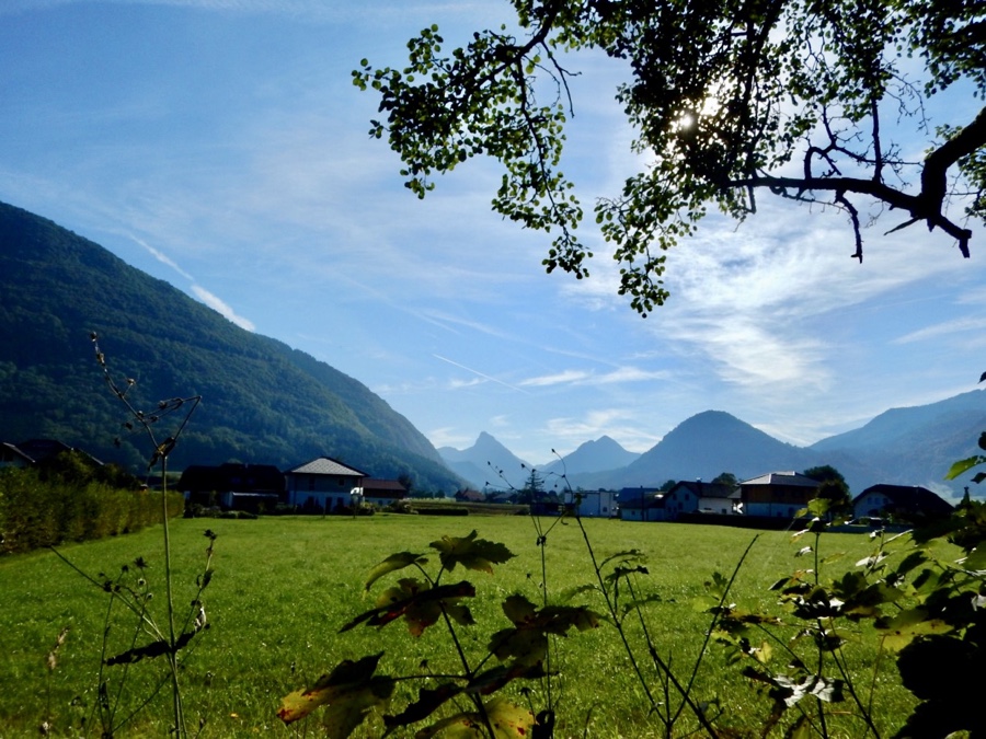 Der Weg führt anfangs durch ein Auwäldchen und bald rückt Grünau und die dahinterliegenden Berge etwas in die Ferne.