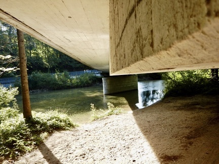 Am linksseitigen Uferbereichs umgehen wir den Ortskern von Grünau. Nach kurzer Zeit erreichen wir im Bereich des Freibades den Zufluss des Grünaubaches.