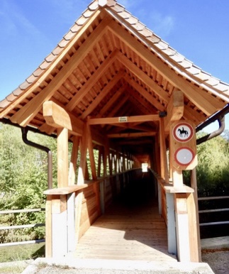Bald erreichen wir die Bahnhaltestelle Kotmühle. Hier queren wir über eine alte Holzbrücke wieder die Alm.