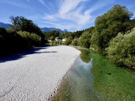 Die Sonne spiegelt sich in der glasklaren Alm, die manchmal die ganze Breite ihres Flussbettes einnimmt und manchmal nur als schmales Bächlein dahin sprudelt und an etlichen Stellen finden sich naturnahe Schotterbänke.