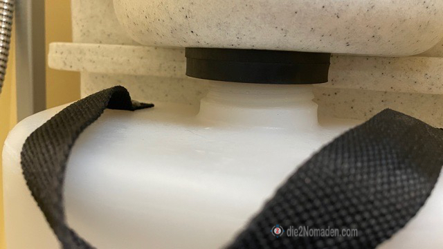 Der Urinbehälter hat ein Fassungsvermögen von 8 Litern und kann in jedes WC geleert werden. Mit ein wenig Wasser verdünnt, kann man den Inhalt auch in der Natur entleeren.