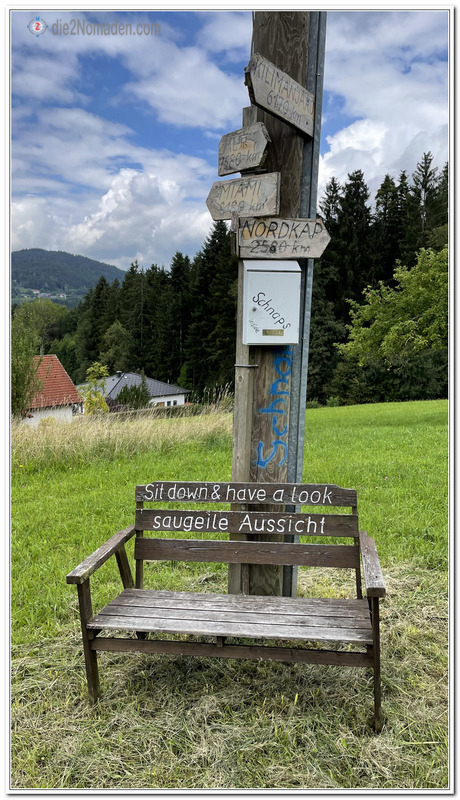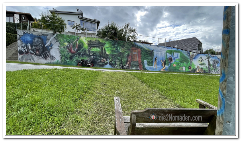 Der Weg Nr. 78 bringt uns zügig die Bergstraße hoch, an Jaukenberg und Lichtenau i.Mkr. vorbei bis zu einer Stützmauer, an der wir großflächige Graffiti vorfinden. Lustigerweise steht gegenüber in einer Wiese eine Bank, die einen zum Hinsetzen auffordert … „sit down & have a look SAUGEILE AUSSICHT“.