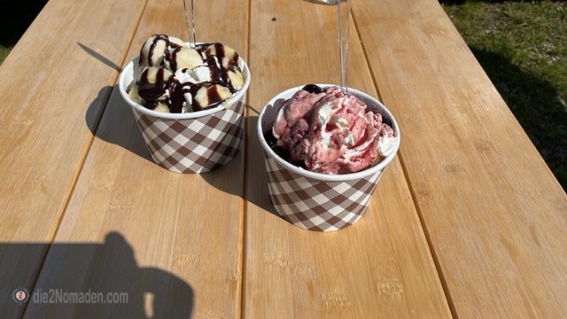 Natürlich lassen wir uns da nicht entgehen und holen uns einen Becher Schoko-Banane und einen Amarena-Kirsche.