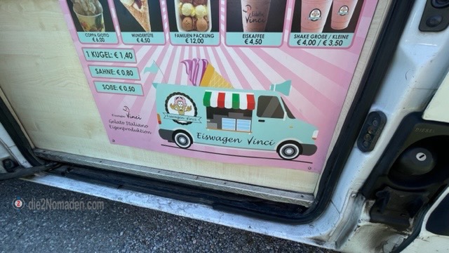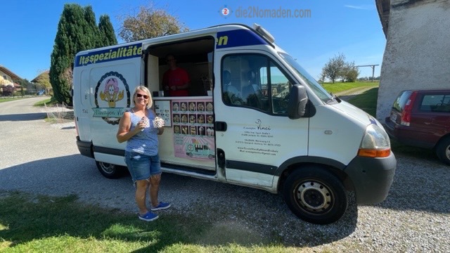 Kurz nachdem wir es uns beim Camper wieder gemütlich gemacht haben, kam Mareile und informierte uns, dass hier an sonnigen Tagen immer wieder mal ein „Eiswagen“ mit exzellenten Gelati-Eisbecherkreationen vorbeikommt und dieser jetzt gerade am Hof eingeparkt hat.