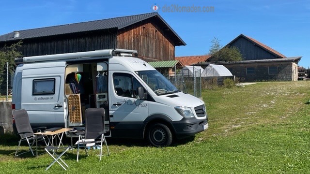 Mareile, die Hausherrin, zeigte uns die möglichen Stellflächen, wo wir unseren Hrn. Hofrat parken konnten. Der Ausblick in die Salzburger Bergwelt von unserem Übernachtungsplatz aus, ist traumhaft schön.