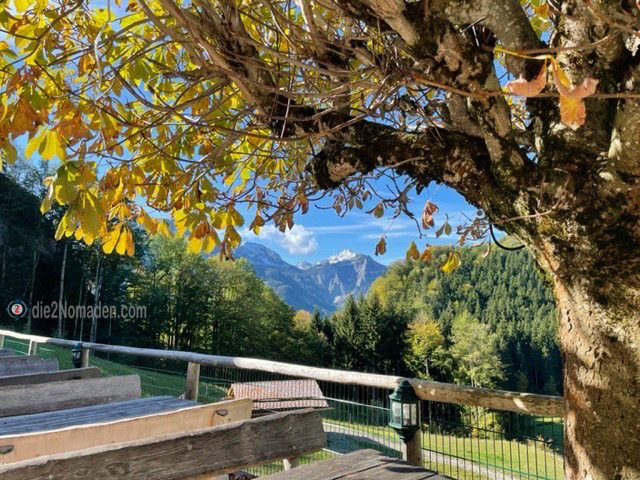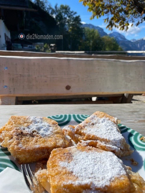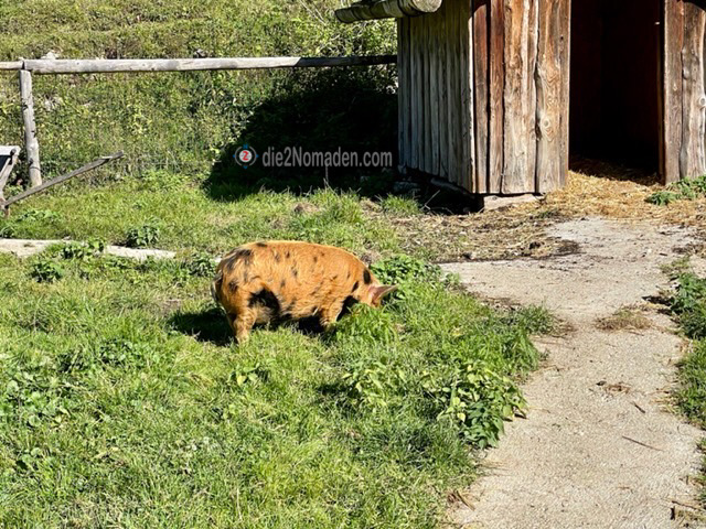Wir erreichen nach vielen Begeisterungsrufen unserer kleinen Tierliebhaberin die Almwirtschaft, werden freundlicherweise mit Polstern für die nassen Bänke versorgt und bestellen zu essen und zu trinken (die Pofesen da oben sind genial).