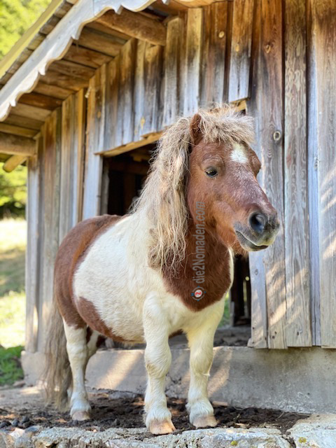 Auf der Alm angekommen erwartet uns strahlender Sonnenschein und blitzblauer Himmel und Lilia jauchzt entzückt, sobald sie die ersten Ponys und Pferde erspäht, die gerade vom Besitzer mit Karotten gefüttert werden.