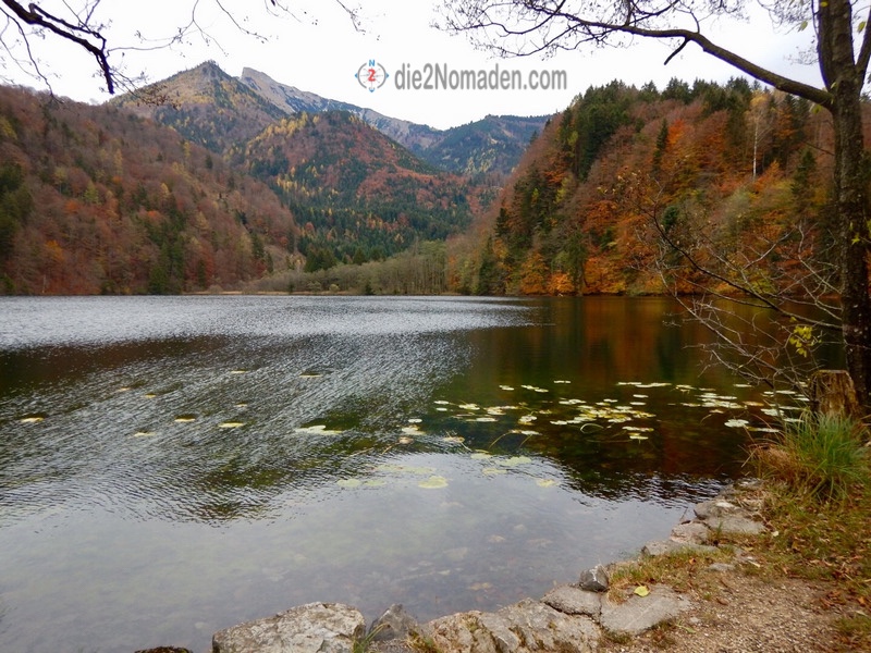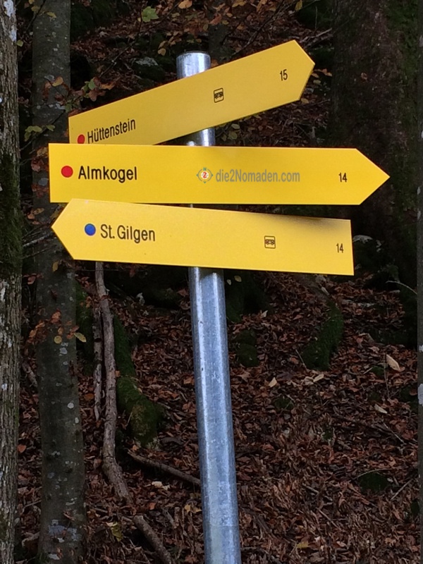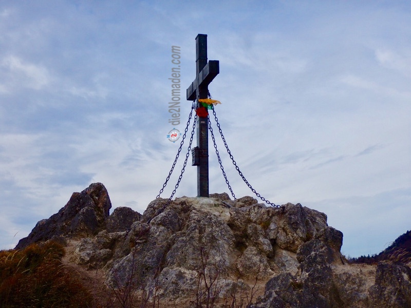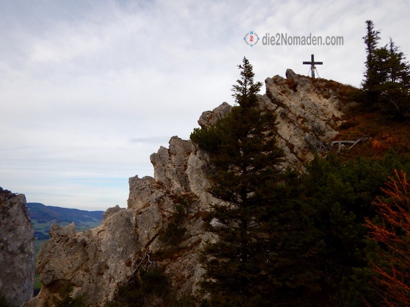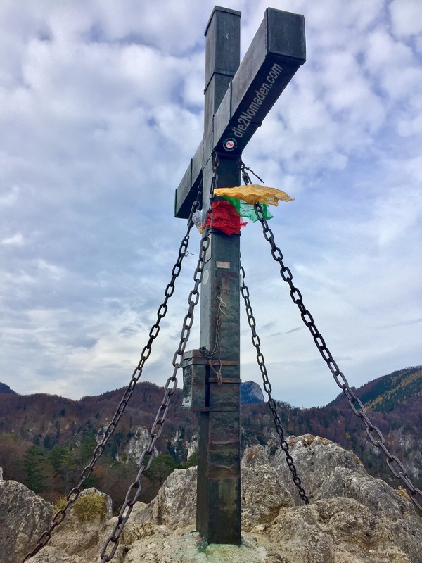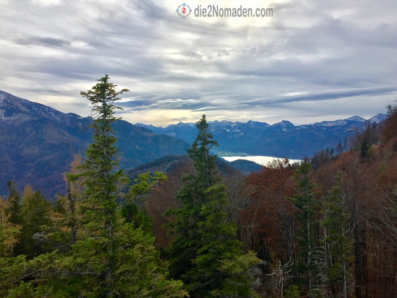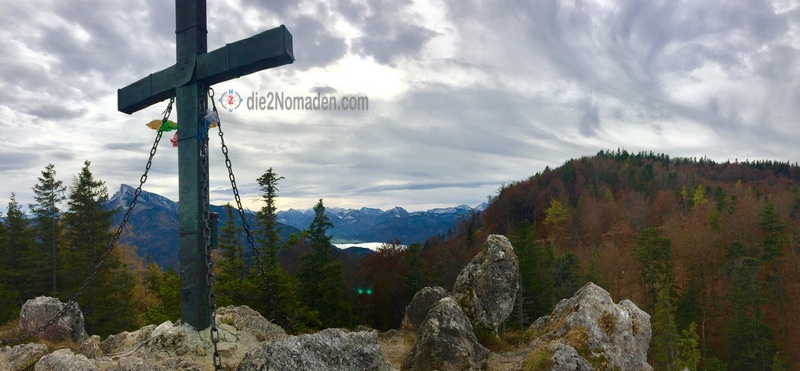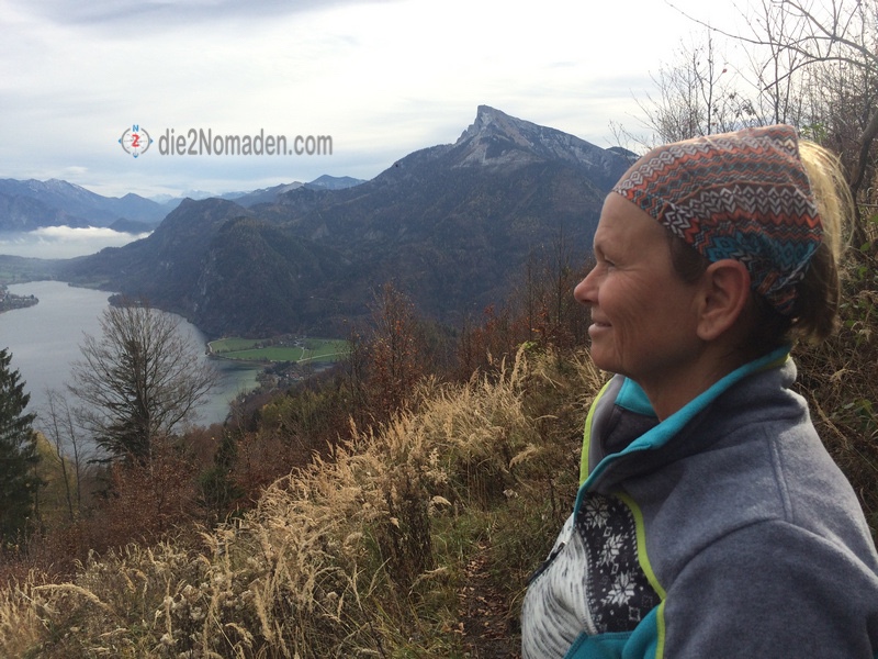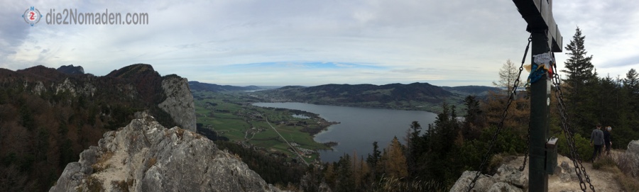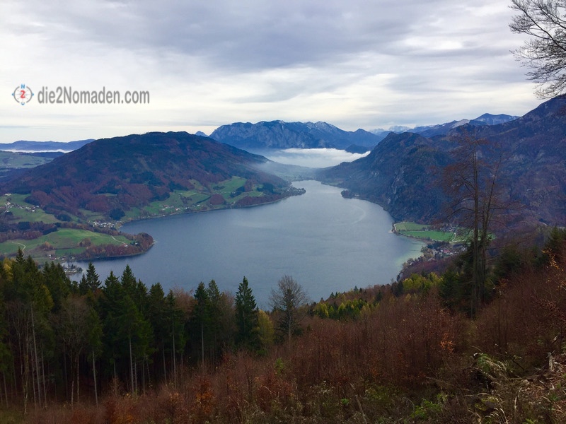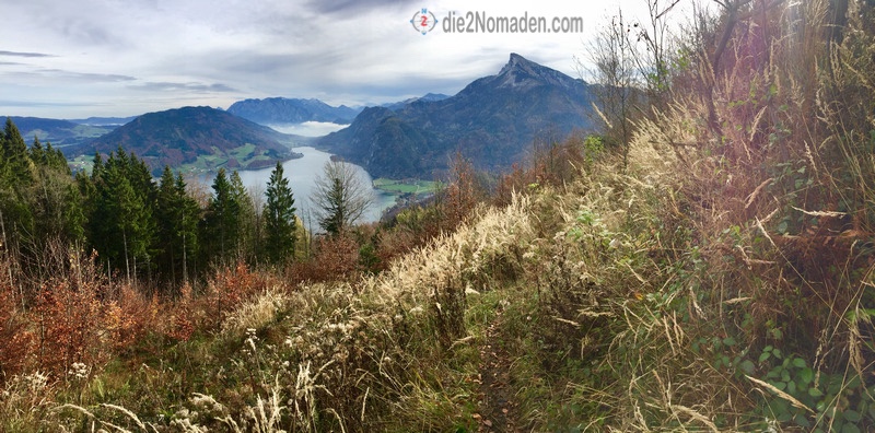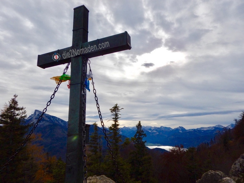 Die perfekte Wanderung im November über laubbedeckte Wege, durch raschelnde Blätter, mit wunderschönen Aussichten auf Mondsee, Attersee und Wolfgangsee zu einem schönen Gipfelkreuz neben der Drachenwand.
