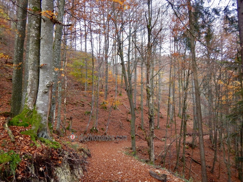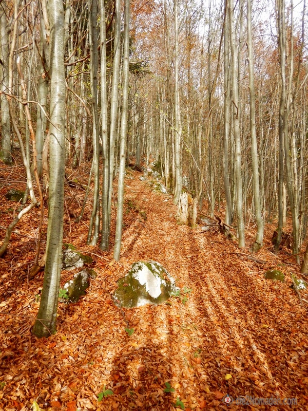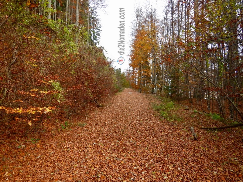 Ab hier führt ein laubbedeckter Hohlweg anfangs eher steil bergan, der uns zu einer Forststraße bringt. Nun geht es gemütlich, aber stetig aufwärts.