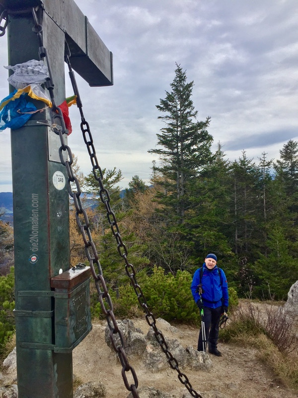 Nach einer kurzen Pause am Gipfel, für ein Bierchen ist es doch zu kalt, geht es für uns nun wieder ein Stück den Wanderweg retour. Wir nehmen nicht den Aufstiegsweg, sondern gehen weiter, bis wir auf eine Forststraße gelangen.
