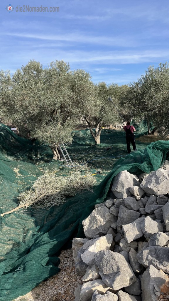 Wir genießen das Gehen auf der Waldstraße, erreichen immer wieder ausgedehnte Olivenhaine, die nun zu dieser Jahreszeit abgeerntet werden. Dazu werden sehr große Flächen rund um die Bäume mit Folie abgedeckt und diese händisch oder mit batteriebetriebenen Rüttelstangen geschüttelt.