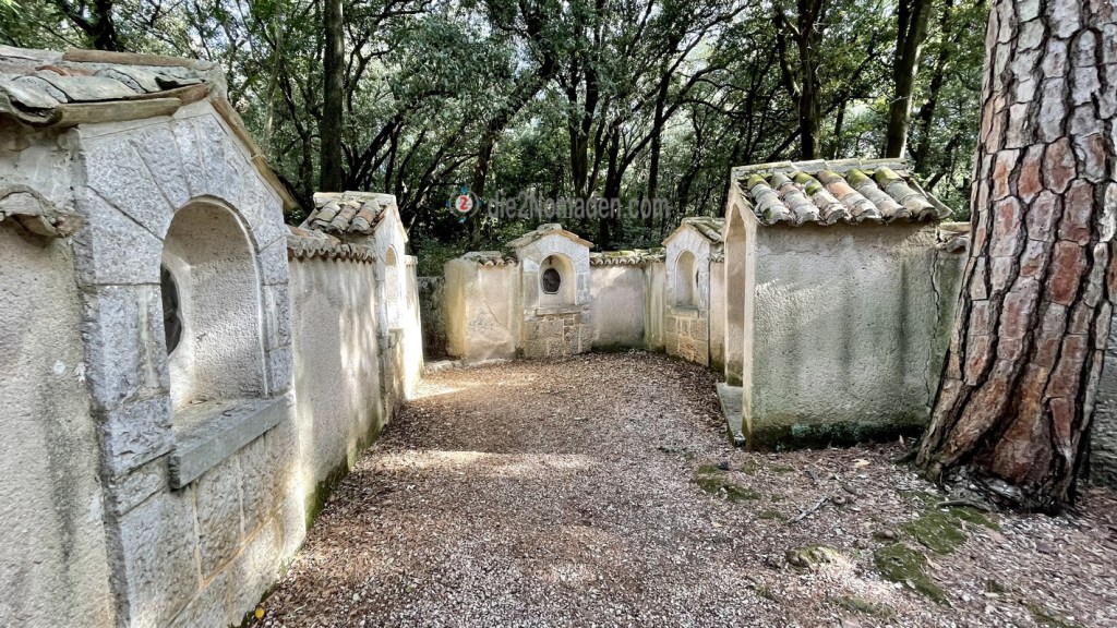 Etwas weiter kann man den steinernen Innenhof des Klosters mit einem alten Brunnen erkunden. Wenn man die Gänge der Anlage weiter geht, kommt man am Inselfriedhof vorbei. Hier sind, in schön verzierten Gräbern, die Mönche begraben.