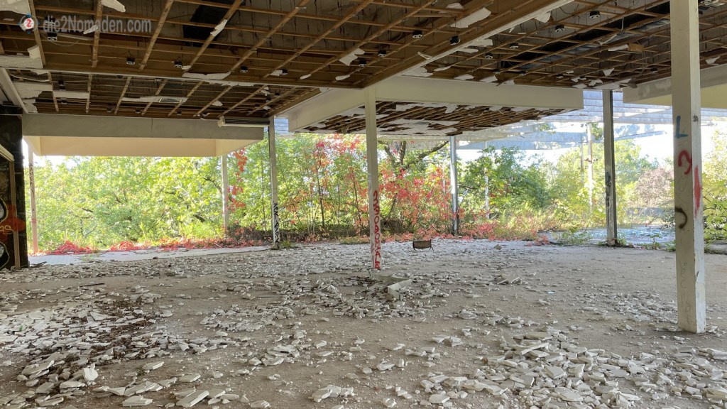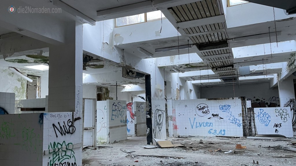 Um die Ecke treffen wir jetzt auf ein richtiges Lost Place, wie man es sich vorstellt, das Hotel und Restaurant „Laguna“. Fenster und Türen sind kaputt, die Einrichtung demontiert bzw. der Rest demoliert, teilweise ist die Decke abgestürzt, usw.