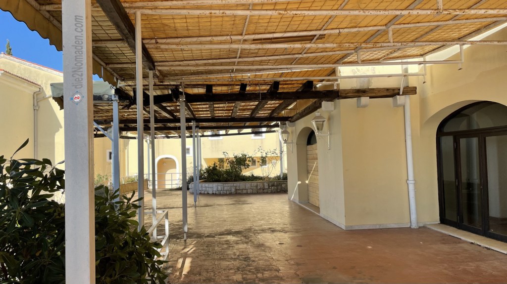 Vom Hafen aus spazieren wir entlang der Bootsanleger vorbei am „Luxury Hotel Riva“ und erblicken das erste Lost Place. Das erste Hotel mit verbretterten Fenstern und Türen sieht nicht wirklich verfallen aus, eher als geschlossen.