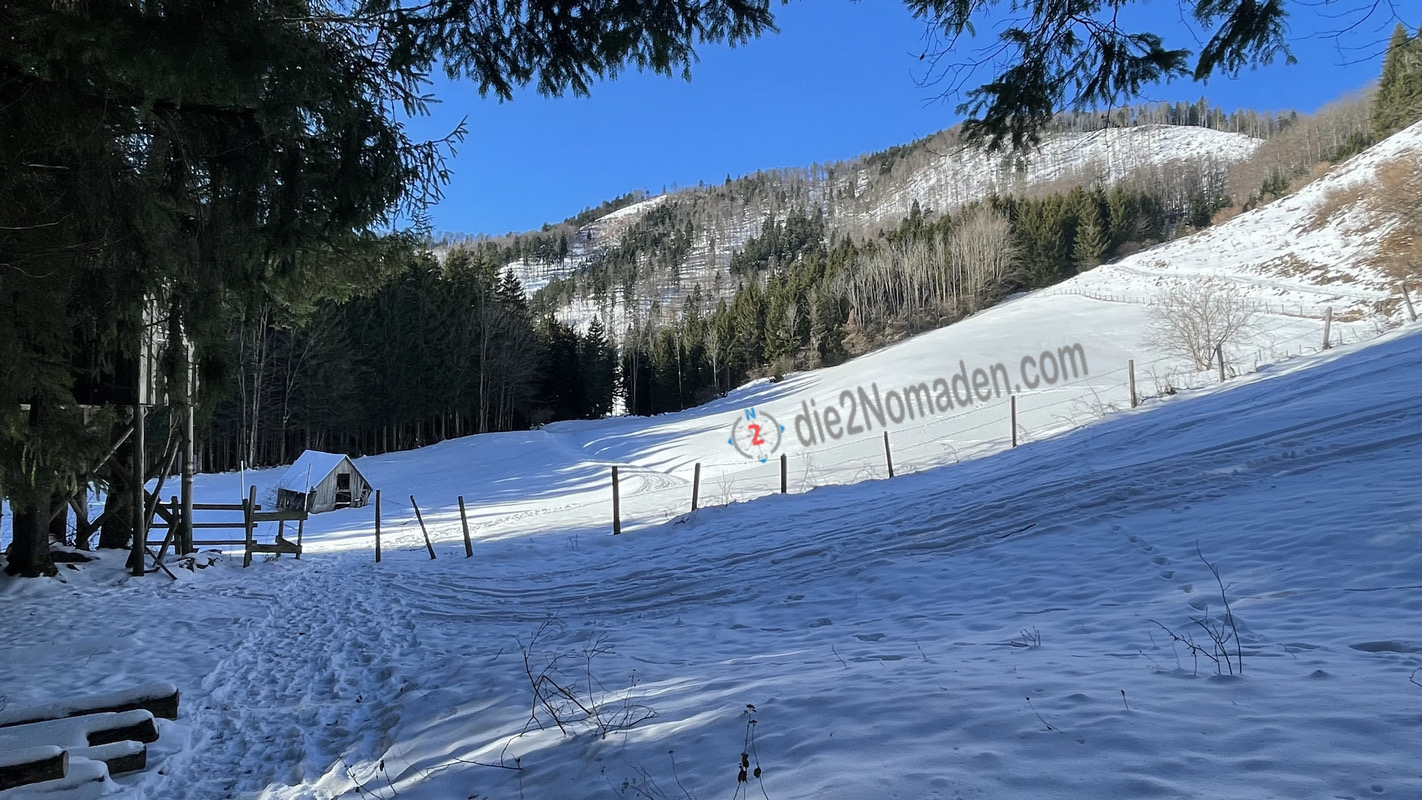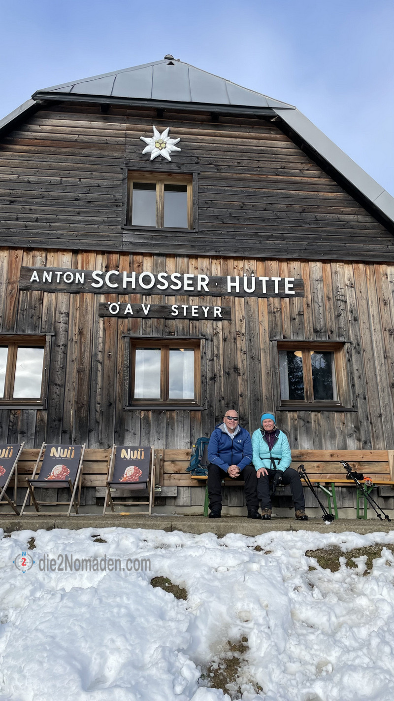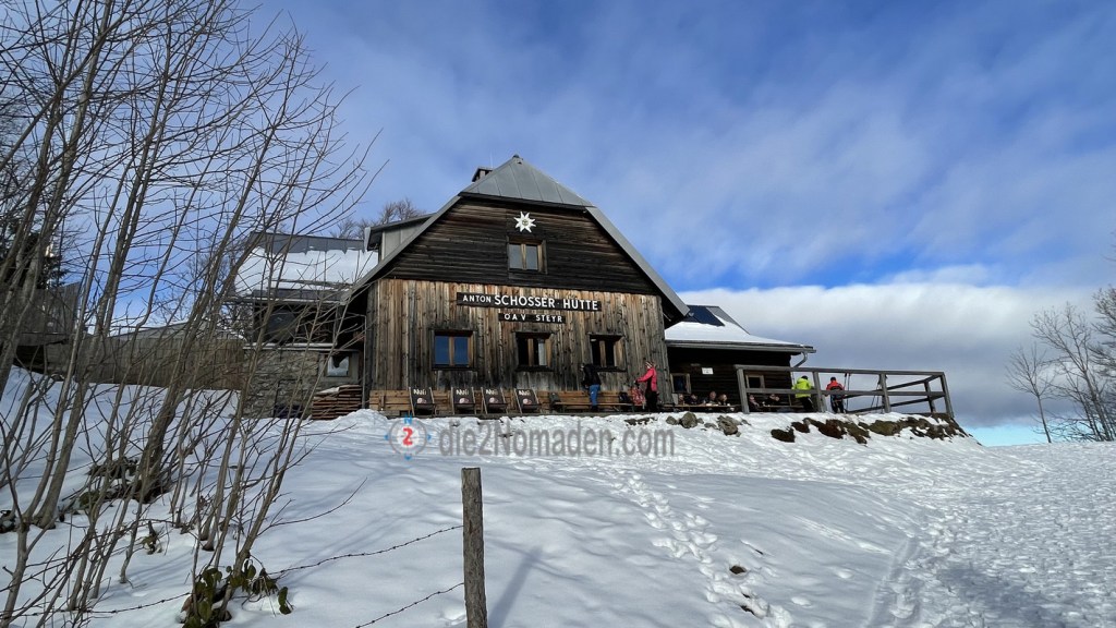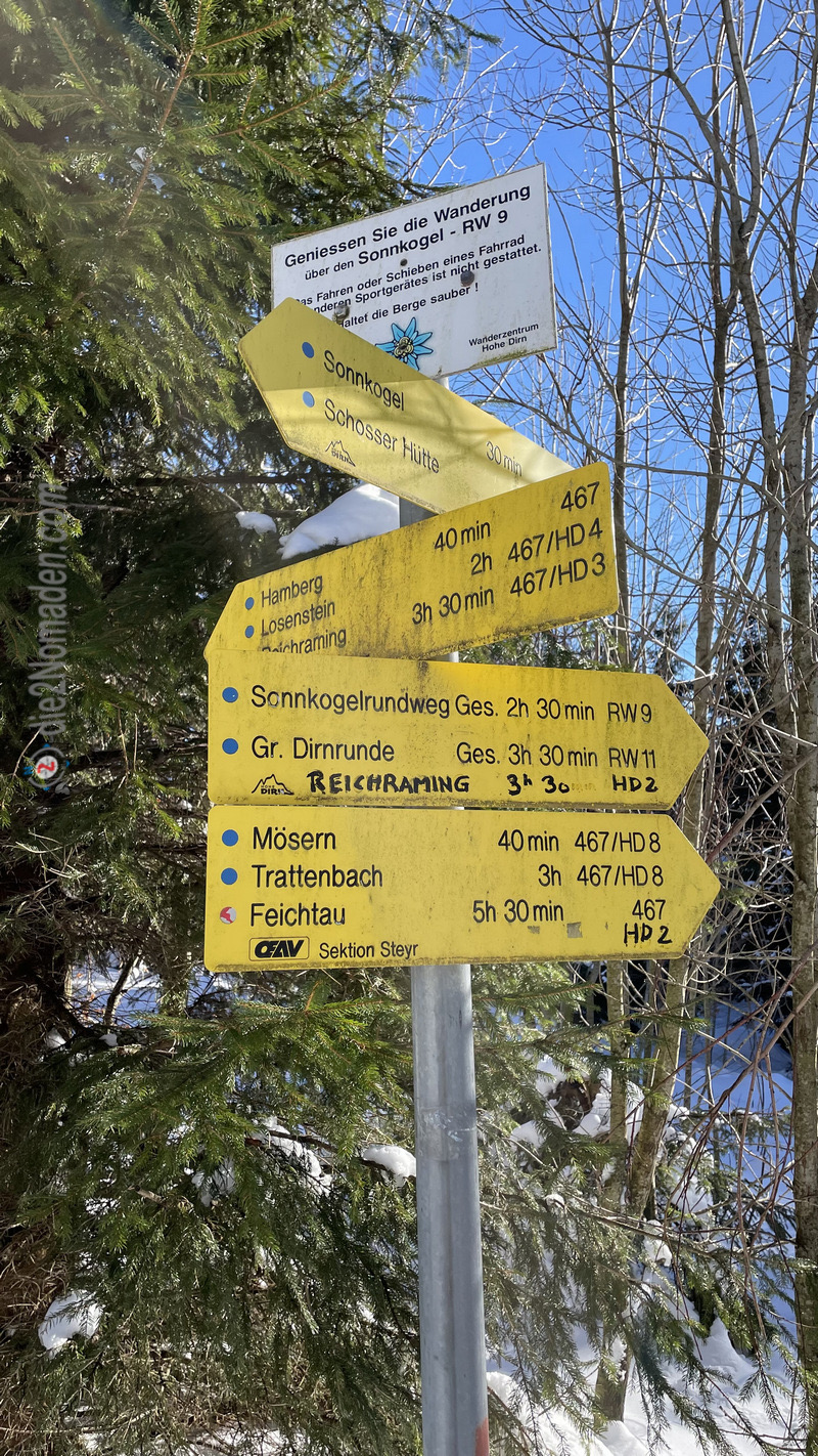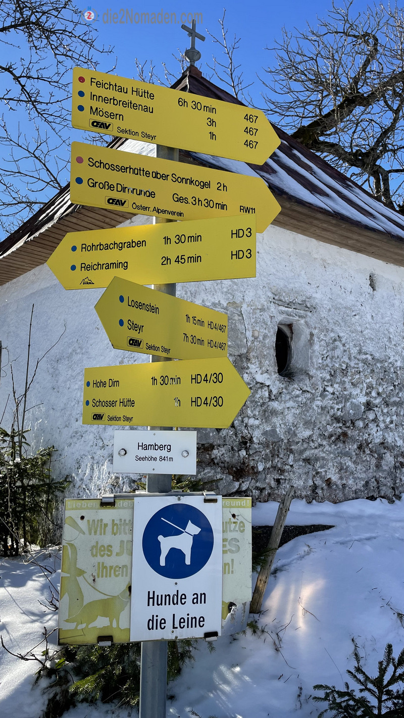 LOSENSTEIN. Wir fuhren nach Losenstein, genauer zum bezahlbaren Wanderparkplatz B unterhalb der Anton Schosser Hütte auf der Hohen Dirn, überlegten kurz bezüglich Schneeschuhen, die wir allerdings aufgrund der geringen Schneelage im Auto ließen. Nur die Grödel nahmen wir mit.