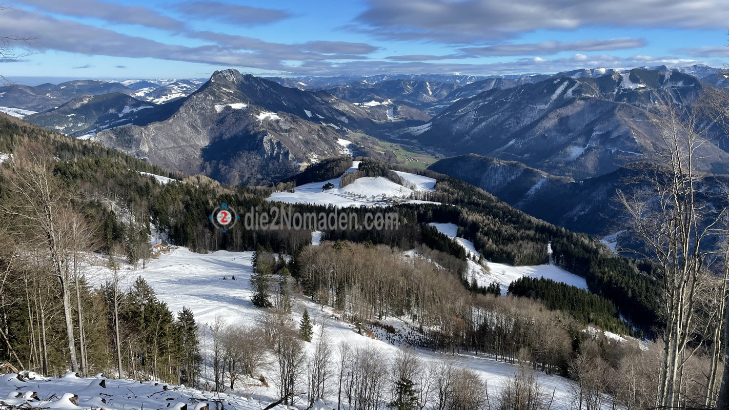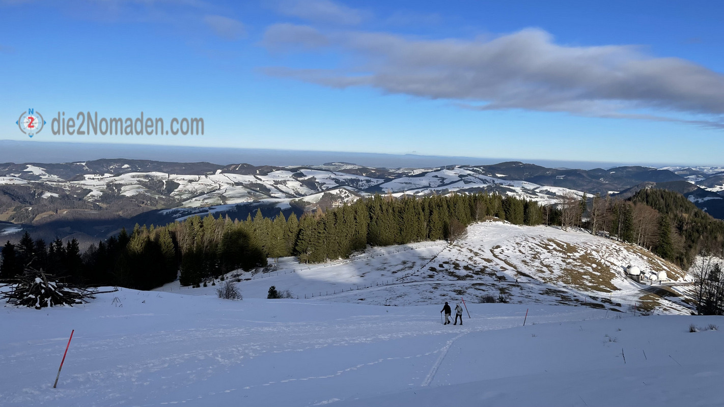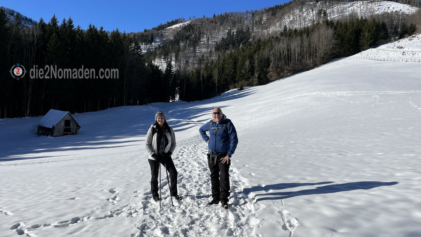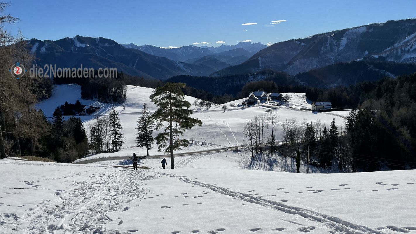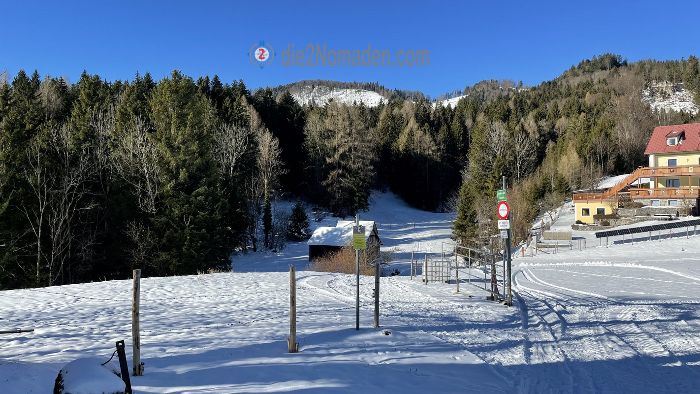 LOSENSTEIN. Wir fuhren nach Losenstein, genauer zum bezahlbaren Wanderparkplatz B unterhalb der Anton Schosser Hütte auf der Hohen Dirn, überlegten kurz bezüglich Schneeschuhen, die wir allerdings aufgrund der geringen Schneelage im Auto ließen. Nur die Grödel nahmen wir mit.