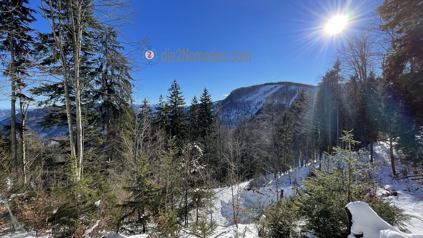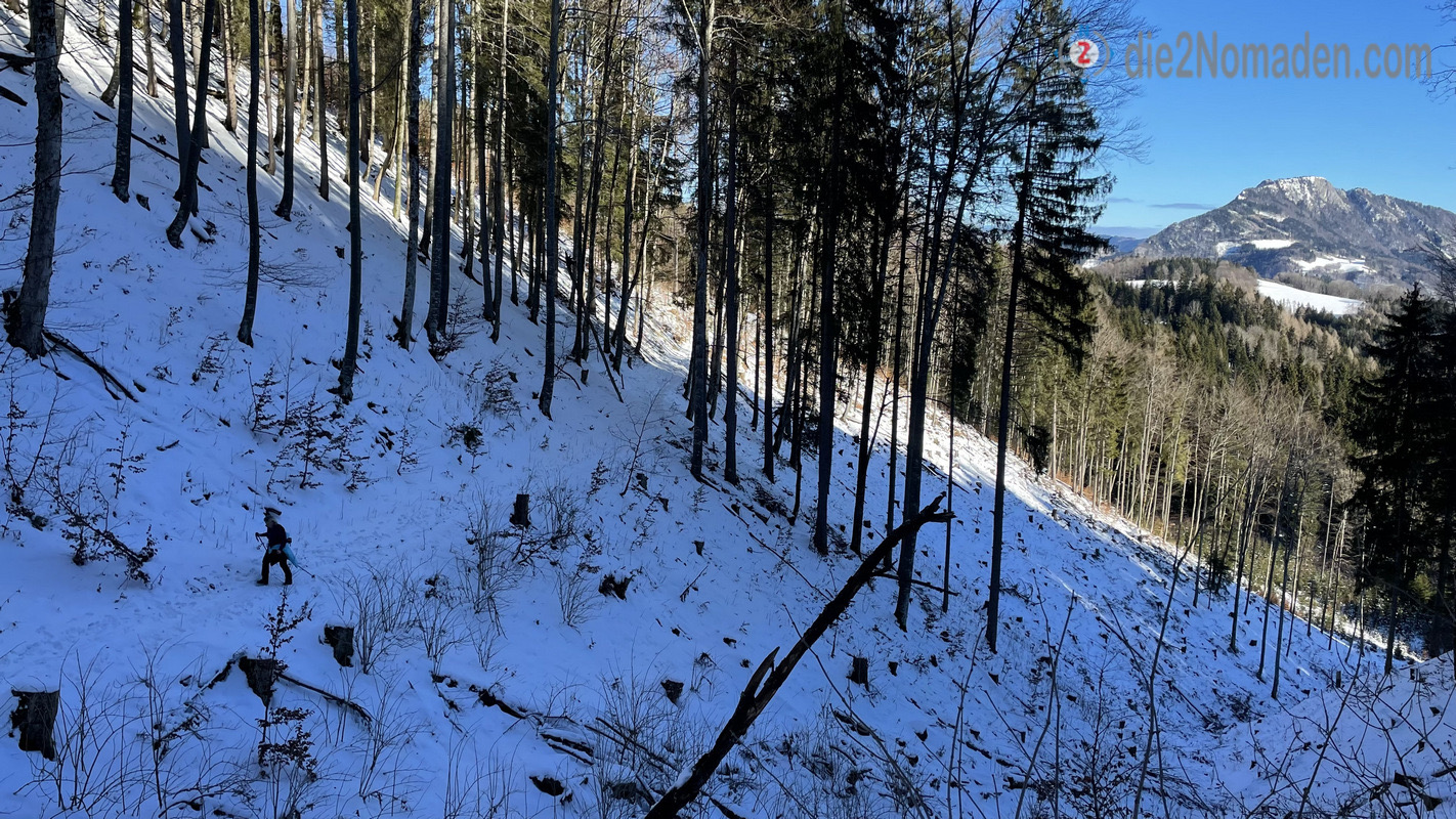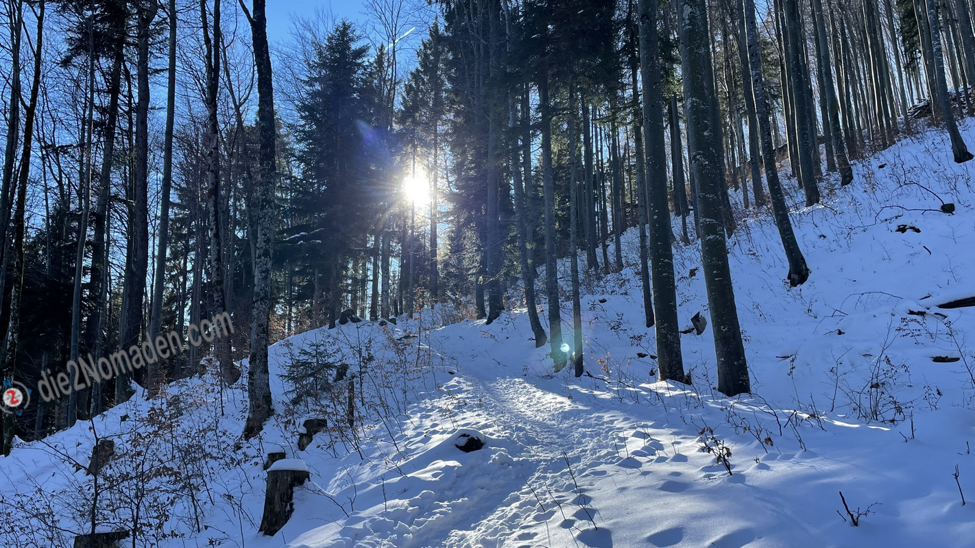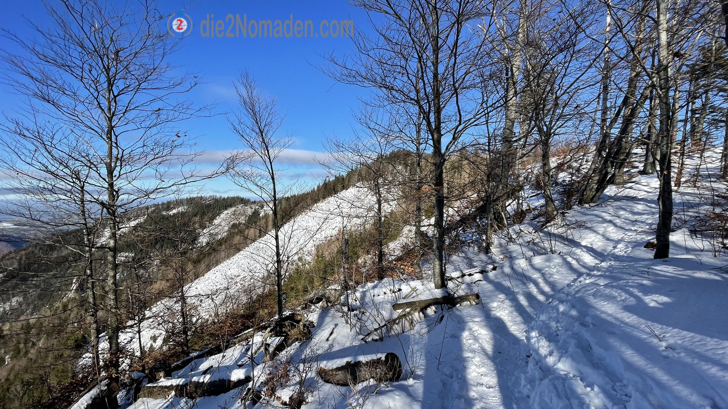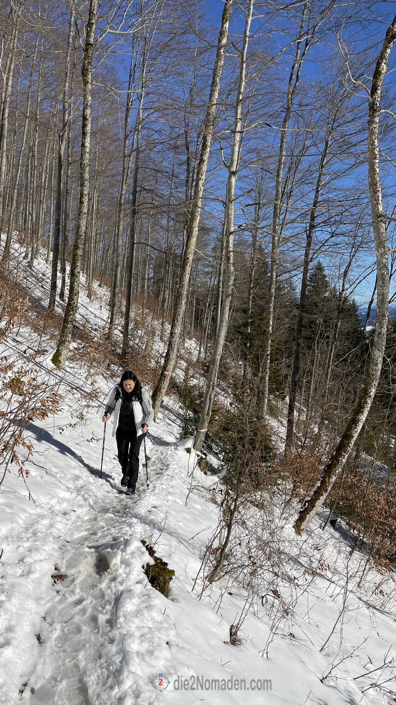 Der Weg durch den Wald ist zauberhaft, weil die Sonne durch die blattlosen Bäume glitzert und wir bemerken bald, dass unsere Aussicht immer schöner wird. Etwas aufpassen müssen wir schon, speziell, weil der Weg in der Hanglage schmal ist und es links dann doch ganz hurtig runtergeht, sollte jemand ausrutschen. Aber da unser Wanderguide Andreas uns netterweise darauf aufmerksam macht, ziehen wir vorsichtig weiter.