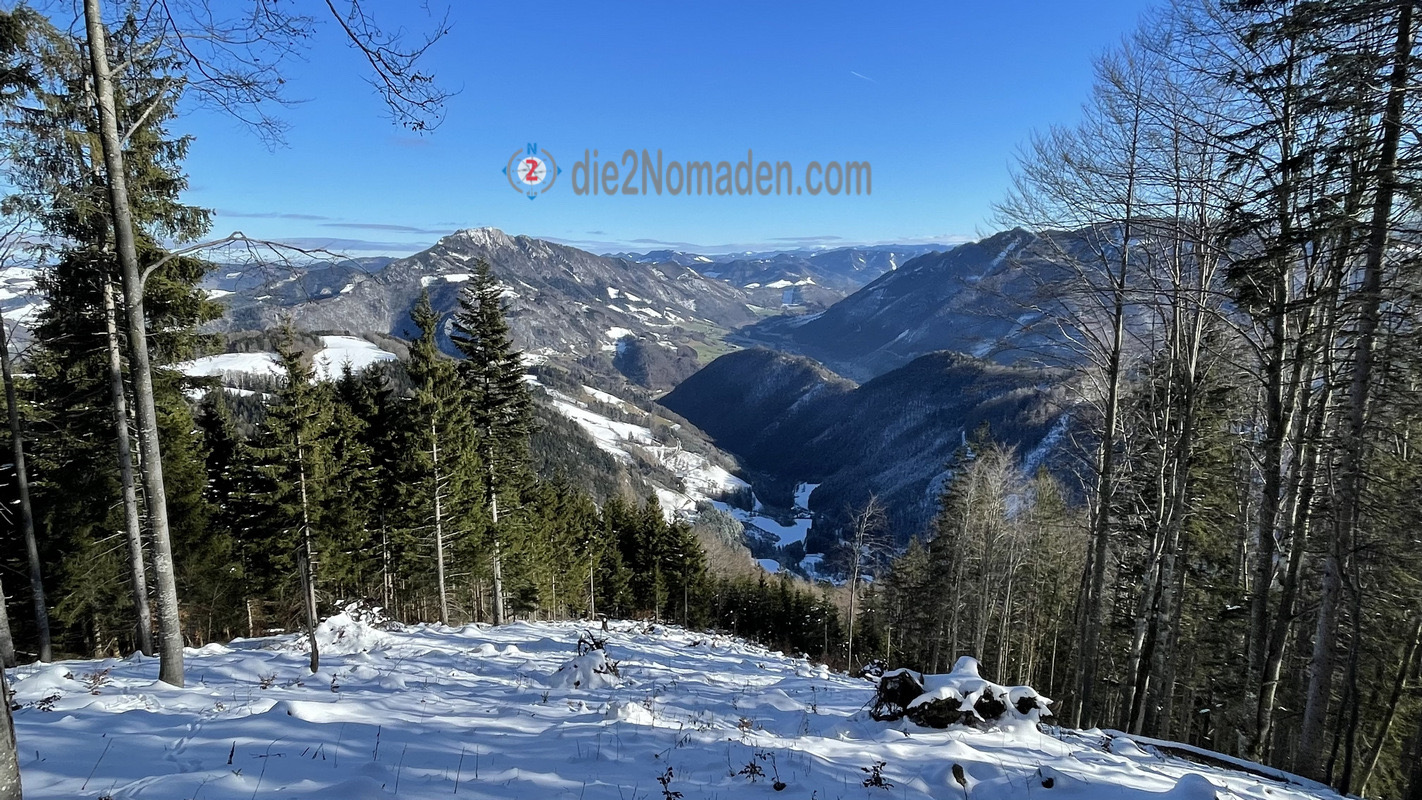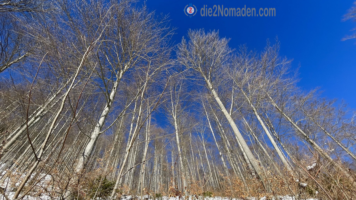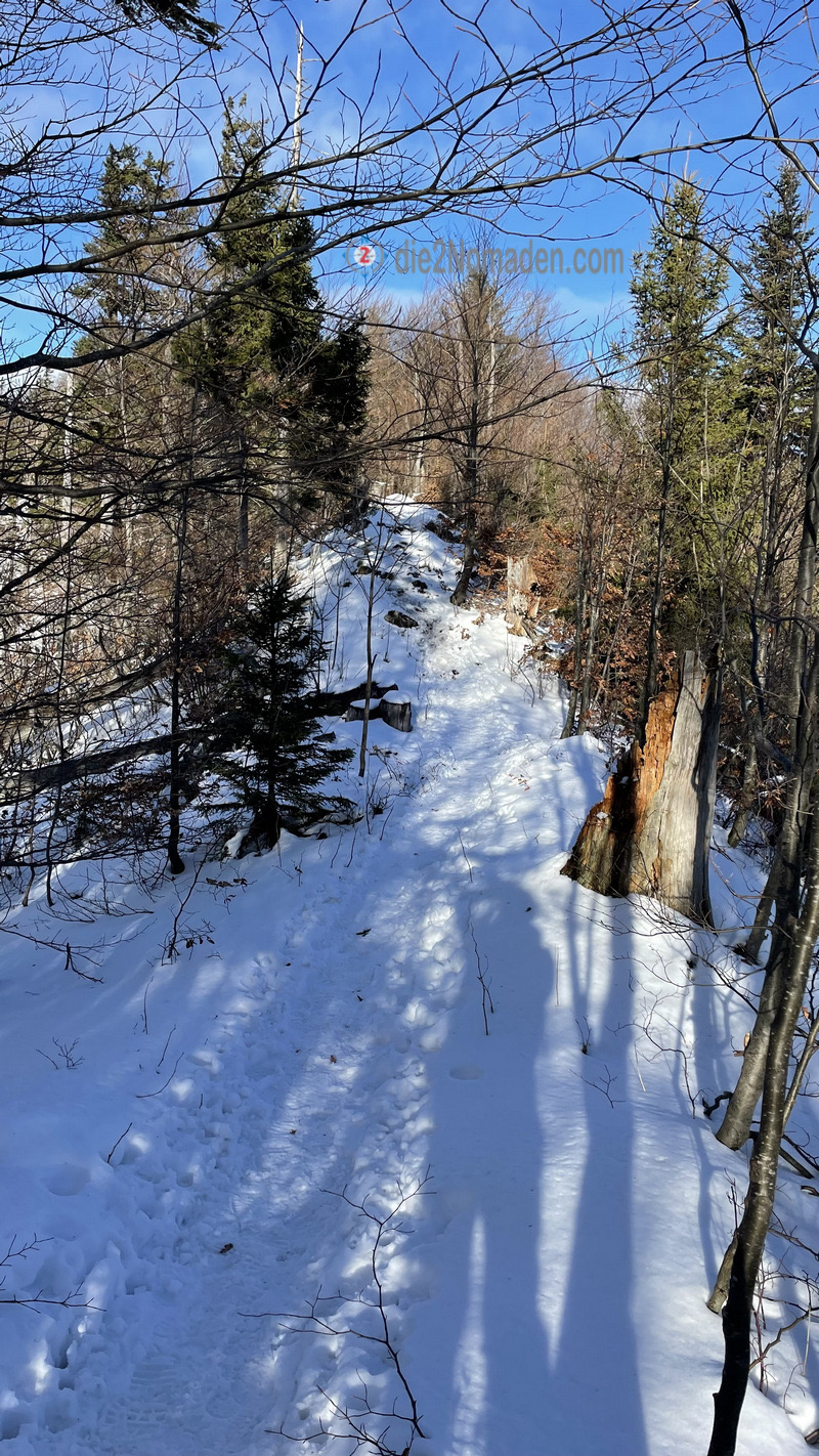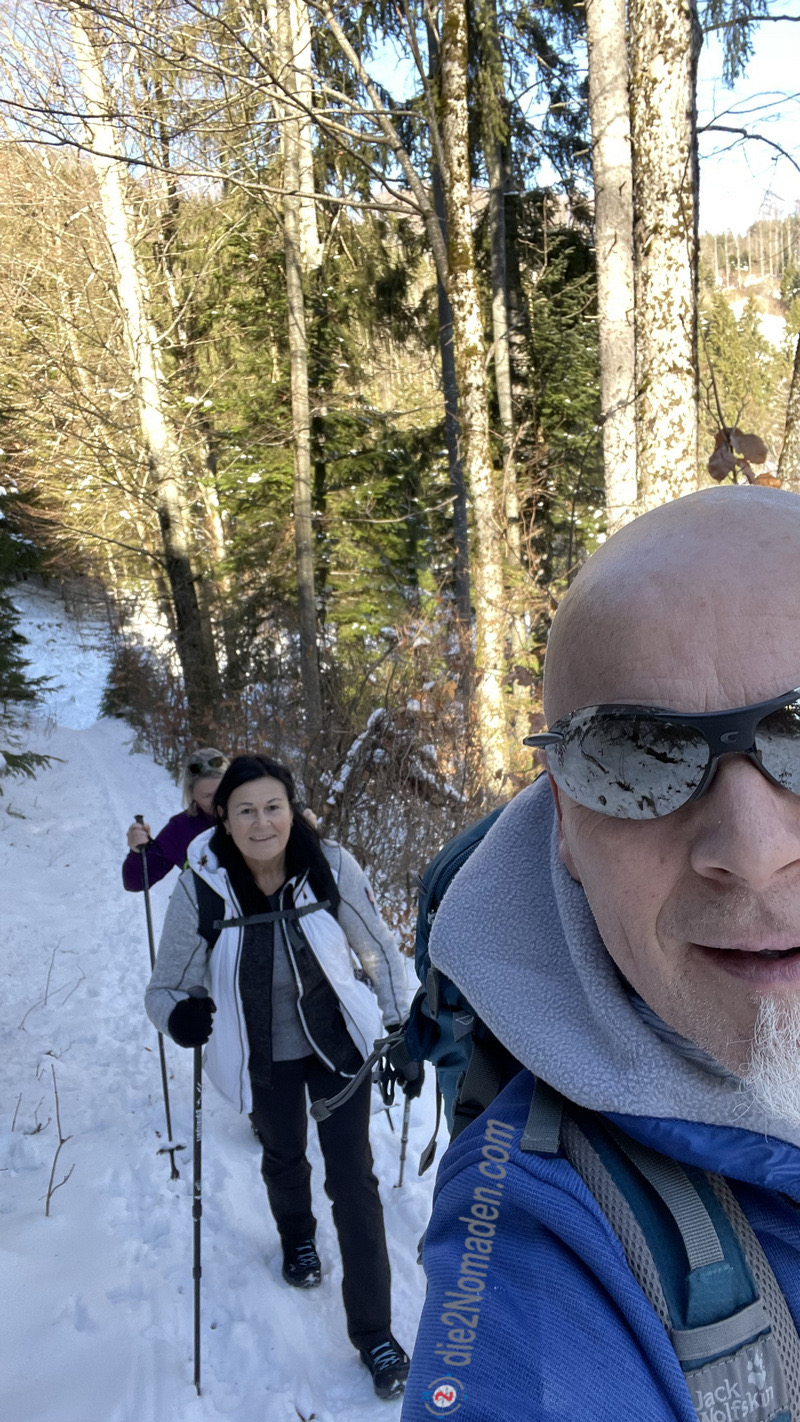 Der Weg durch den Wald ist zauberhaft, weil die Sonne durch die blattlosen Bäume glitzert und wir bemerken bald, dass unsere Aussicht immer schöner wird. Etwas aufpassen müssen wir schon, speziell, weil der Weg in der Hanglage schmal ist und es links dann doch ganz hurtig runtergeht, sollte jemand ausrutschen. Aber da unser Wanderguide Andreas uns netterweise darauf aufmerksam macht, ziehen wir vorsichtig weiter.