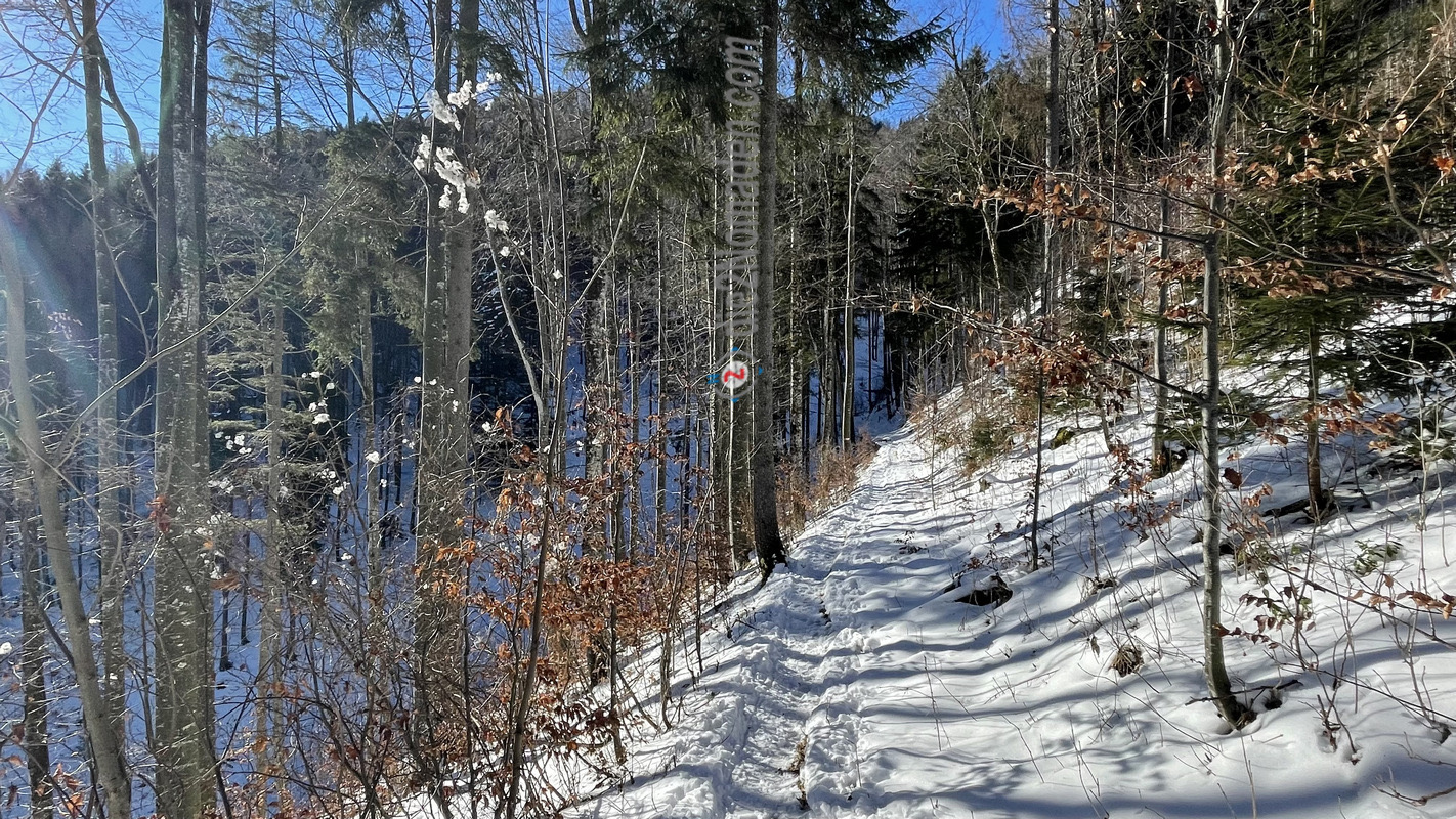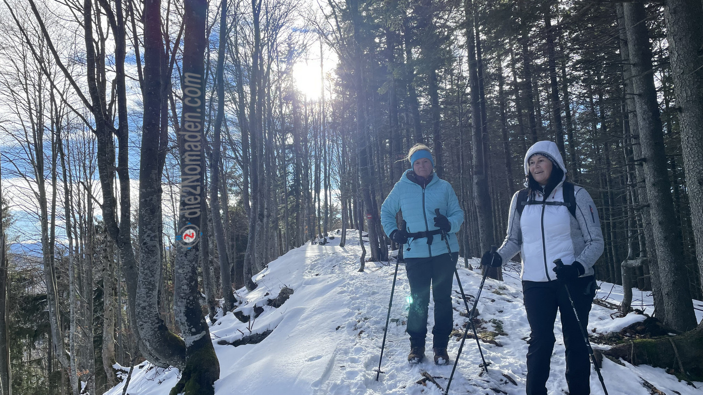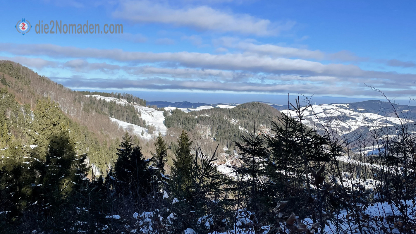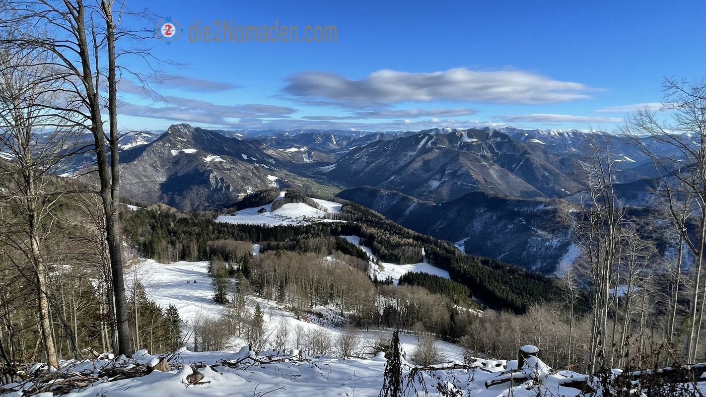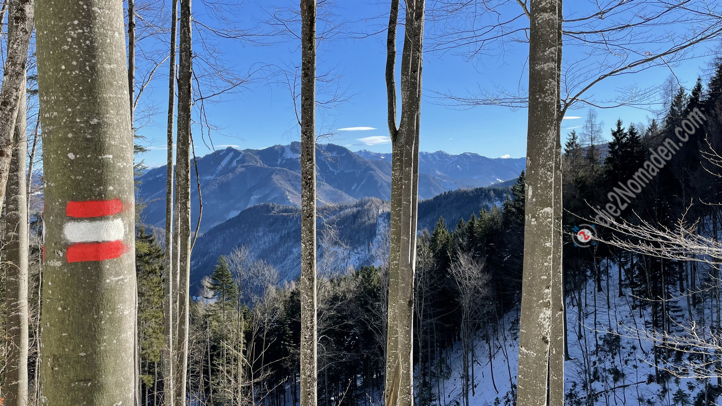 Der Weg durch den Wald ist zauberhaft, weil die Sonne durch die blattlosen Bäume glitzert und wir bemerken bald, dass unsere Aussicht immer schöner wird. Etwas aufpassen müssen wir schon, speziell, weil der Weg in der Hanglage schmal ist und es links dann doch ganz hurtig runtergeht, sollte jemand ausrutschen. Aber da unser Wanderguide Andreas uns netterweise darauf aufmerksam macht, ziehen wir vorsichtig weiter.