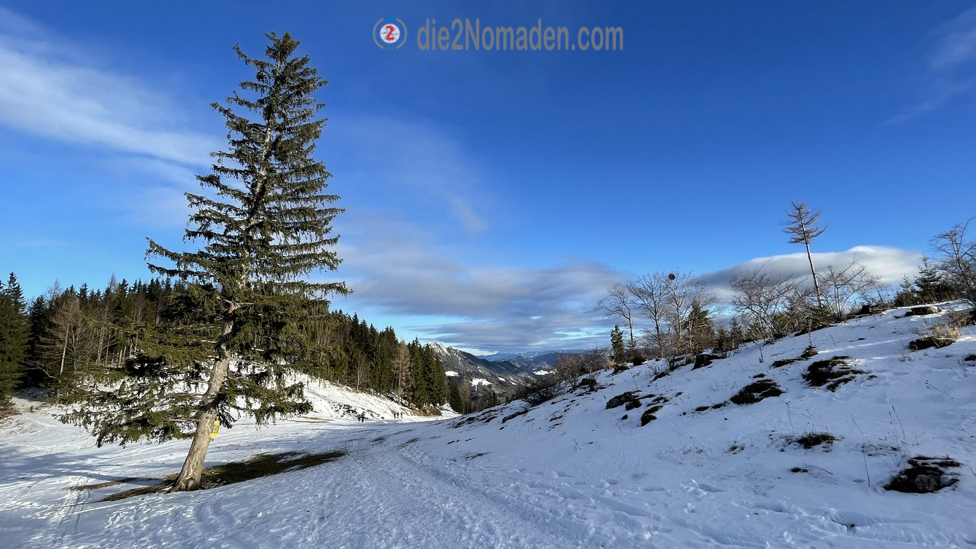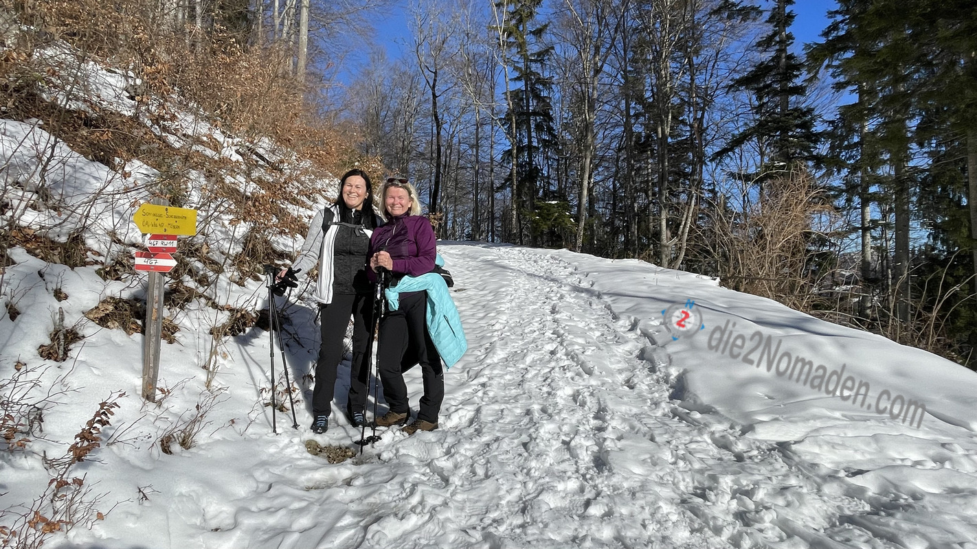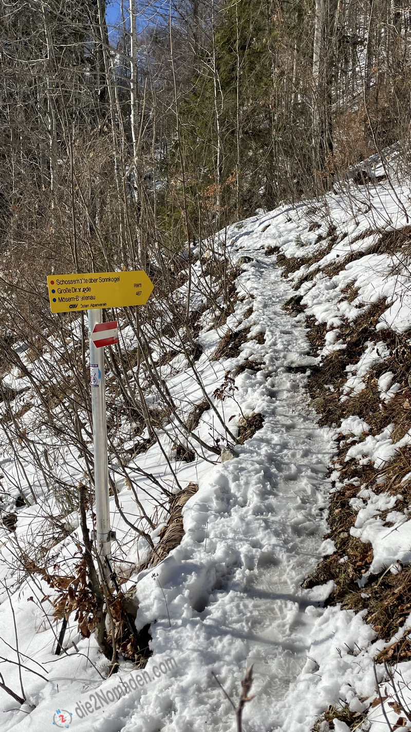 Hier beginnt unser Weg, der hier als „Schosserhütte über Sonnkogel“ markiert ist. Gemütlich stapfen wir dahin, erst einen breiteren Weg, der dann immer schmäler wird. Anita und ich sind froh über unsere Stöcke, die uns doch etwas mehr Halt geben. Stetig geht es bergauf – klar, wo wir doch vorher so flockig leicht über die Wiese abwärts marschiert sind – und ich stelle fest: „Ich bin viel zu warm angezogen“ – also raus aus der oberen Schicht. Nicht einmal Stirnband oder Handschuhe brauchen wir, unserer inneres Wärmekraftwerk funktioniert vorzüglich.