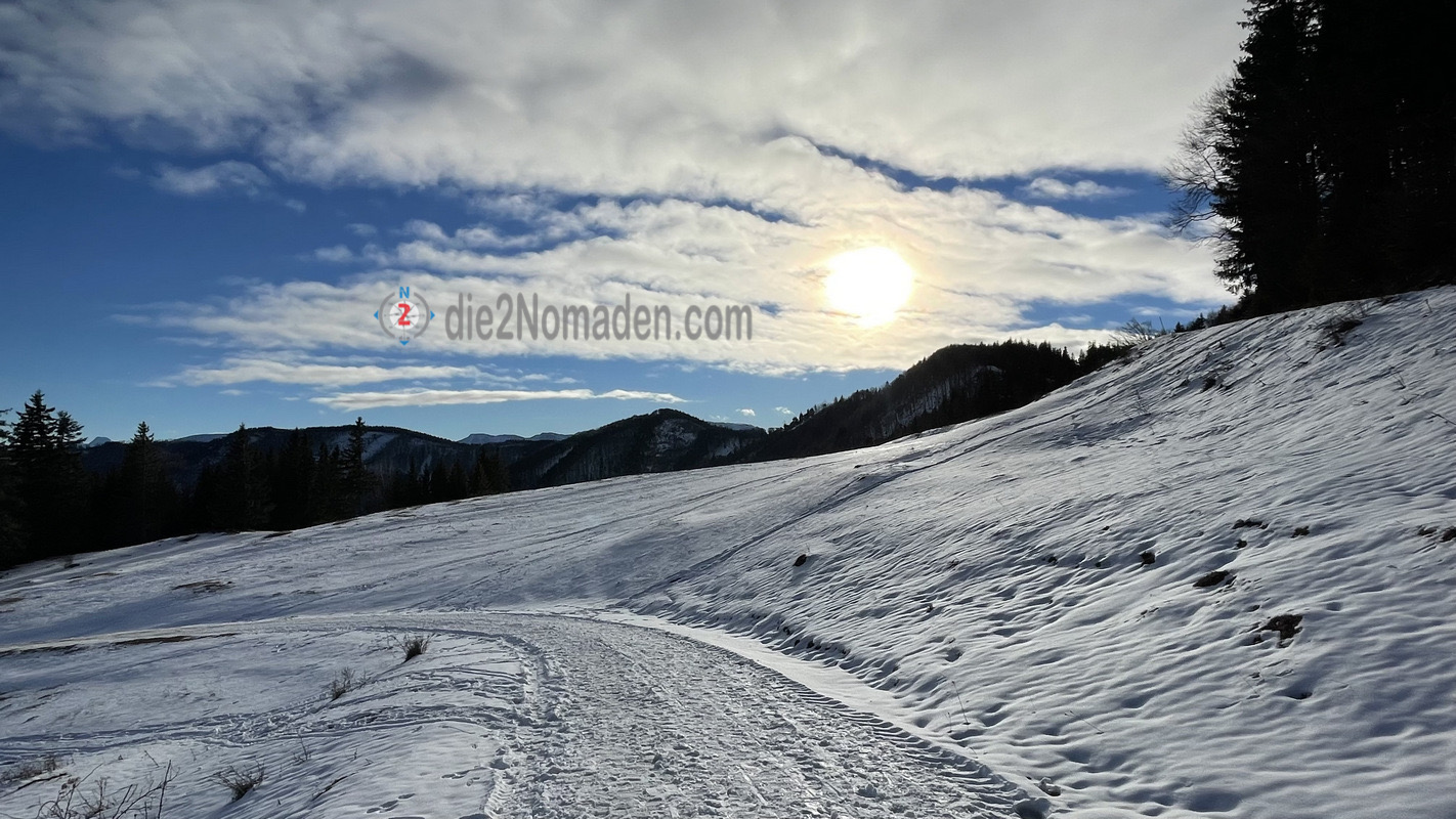 Wir queren eine Froststraße und der Gegensatz vom blitzblauen Himmel zum glitzernden weißen Schnee lässt uns die Anstrengung schnell vergessen … für kurze Zeit, denn gleich schwitzen und schnaufen wir wieder im Gleichklang weiter. Manche mehr und manche weniger – einer gar nicht. 😉