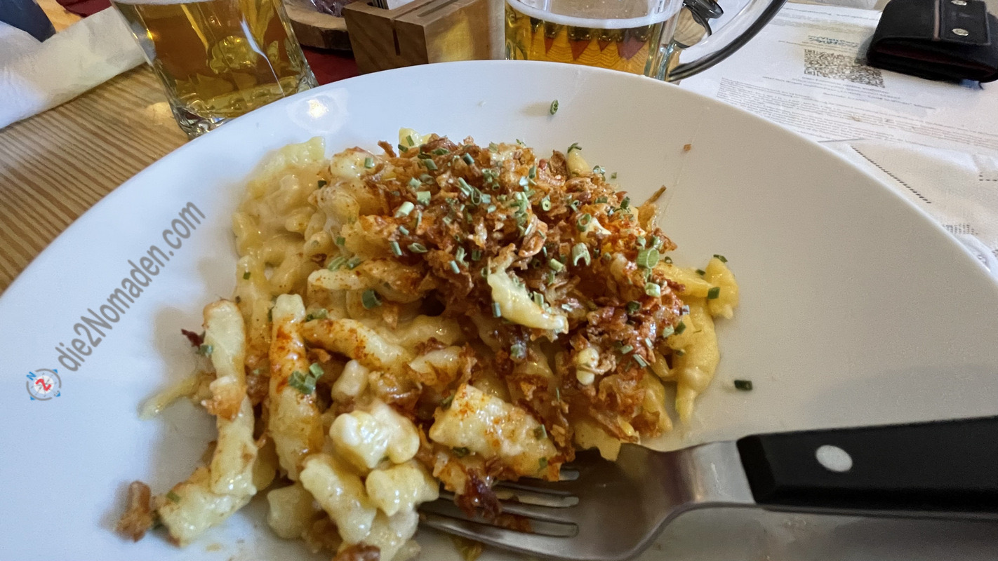 Wir beschließen aber trotzdem, nach drinnen zu gehen und in der warmen Gaststube (für Insider 😉 2G) Kasnocken und eine Kaspressknödelsuppe zu uns zu nehmen und unsere Kraftreserven für den Abstieg zu stärken. Übrigens serviert der Wirt auch draußen – ließe sich in der Sonne ganz gut aushalten, wenn man nicht so verschwitzt wie wir wäre.
