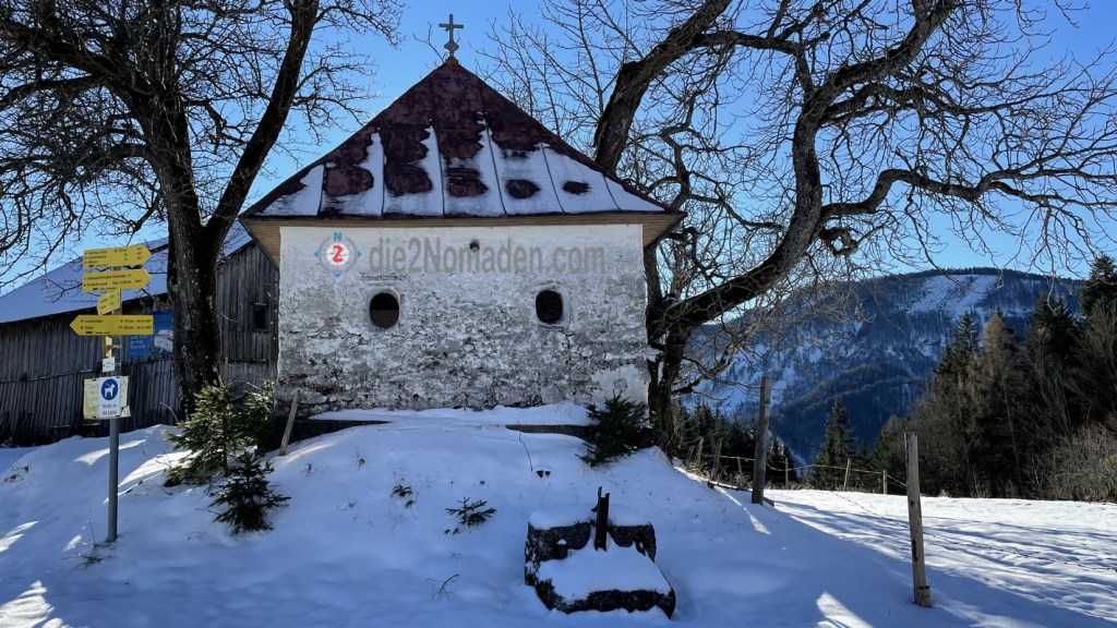Nachdem der Einstieg unserer geplanten Wanderung unterhalb des Parkplatzes lag, wanderten wir erst einmal im strahlenden Sonnenschein bergab, querfeldein auf dem bereits ausgetretenen Weg, hinunter zur Kapelle neben einem Bauernhof, wo zwar ein Parkplatz am Plan eingezeichnet war, aber den es anscheinend nicht mehr gibt und einfach so auf fremden Grund parken, wollten wir auch nicht.