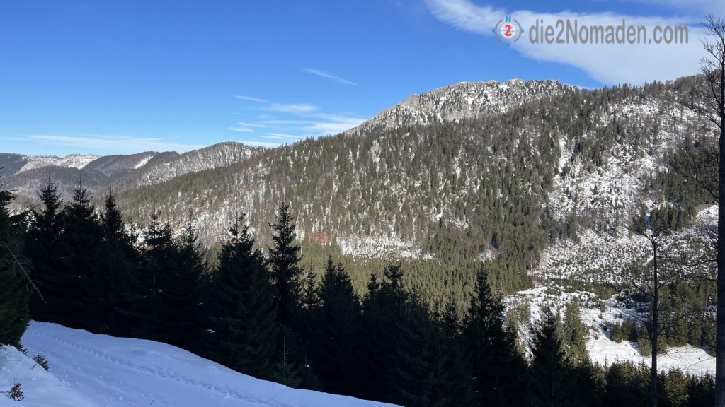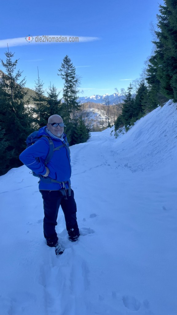 Ein paar Fotos noch und wir steigen wieder hinab zur Forststraße, der wir nun etwas leichter auf unserem bereits gespurten Weg zurück durch den Pulverschnee folgen, bis wir wieder auf die vereiste Froststraße kommen, wo wir bis zum Parkplatz Schindlbach/Märchenwald einen Hatscher hinlegen.