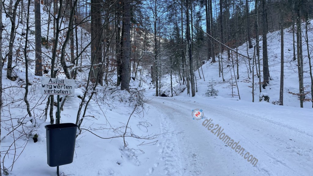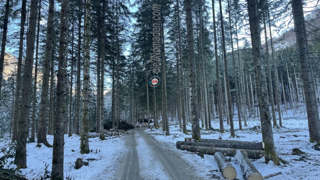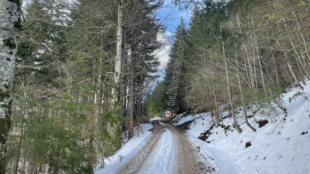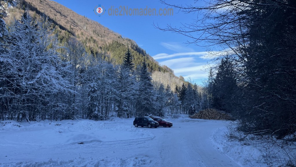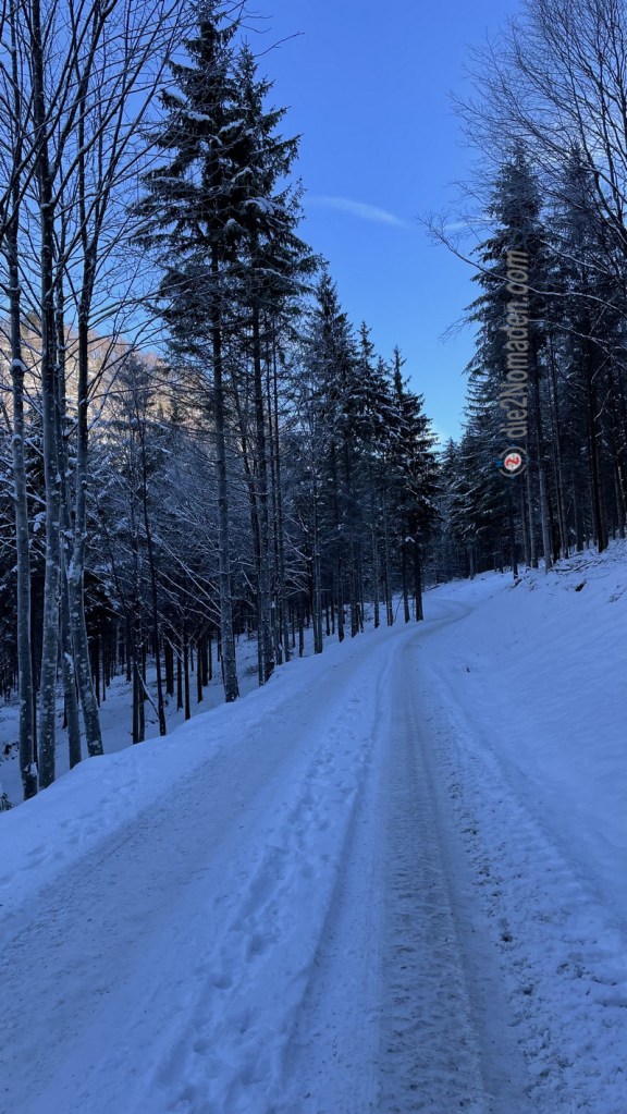 Wir parken am Parkplatz des ehemaligen Kinderland/Märchenwald Schindlbach, rüsten uns gegen die Kälte und wandern die Forststraße entlang, die teilweise ziemlich vereist ist, daher beschließen wir nach einiger Zeit, unsere Grödel anzulegen.