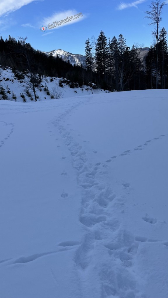 Spätestens zu dem Zeitpunkt, wo es nur mehr Tierspuren im Schnee gibt und wir die ersten Spuren in den dann doch halbwegs tiefen Pulverschnee stapfen.