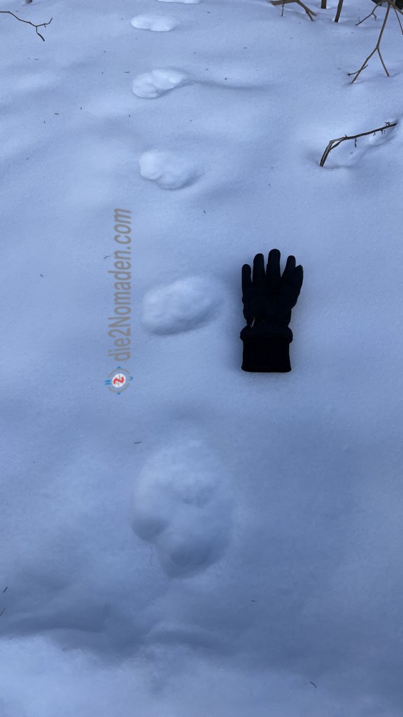 Bis … ja bis wir eine wirklich interessante Spur im Schnee entdecken, die unseren Weg quert. Ich lege zur Demonstration einen Handschuh daneben.