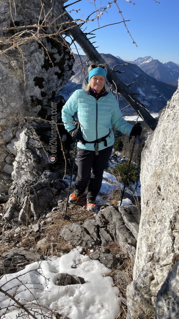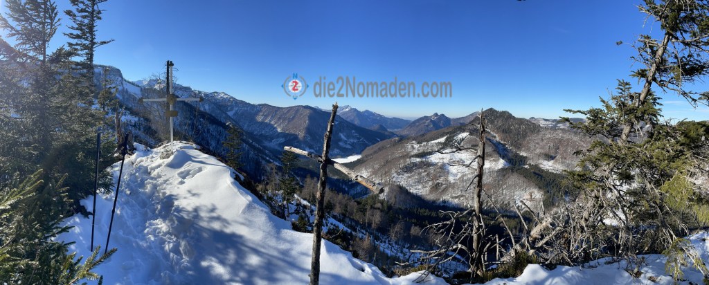 Dann sind wir wieder froh über unsere Grödel, denn die letzten paar Meter zum Gipfel hinauf sind rutschig, aber wir erreichen nach einigen Minuten den Gipfel mit seinen zwei Kreuzen – ein altes, aus Ästen gezimmertes Kreuz und ein neueres, das so verheißungsvoll glitzernd in der Sonne die Wanderer lockt.