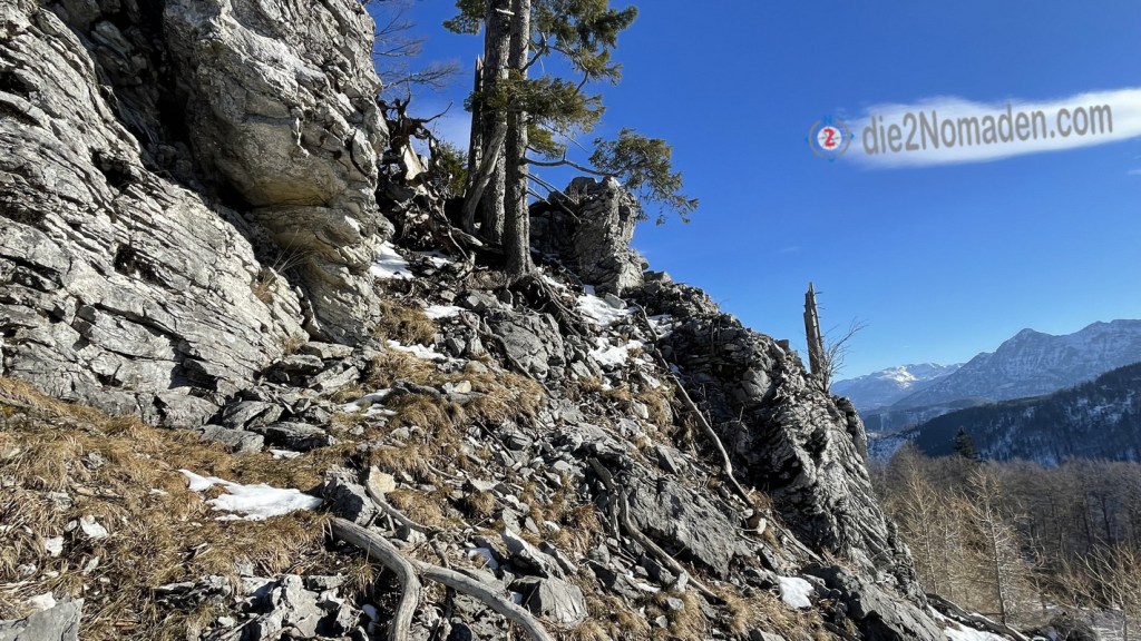 Diese verflixte Forststraße zieht sich wie „a Strudelteig“, bis wir dann auf einem Felsklotz über uns das Gipfelkreuz in der Sonne golden leuchten sehen. Wir erreichen dein Einstieg zum Gipfelkreuz und machen hier eine kurze Pause.
