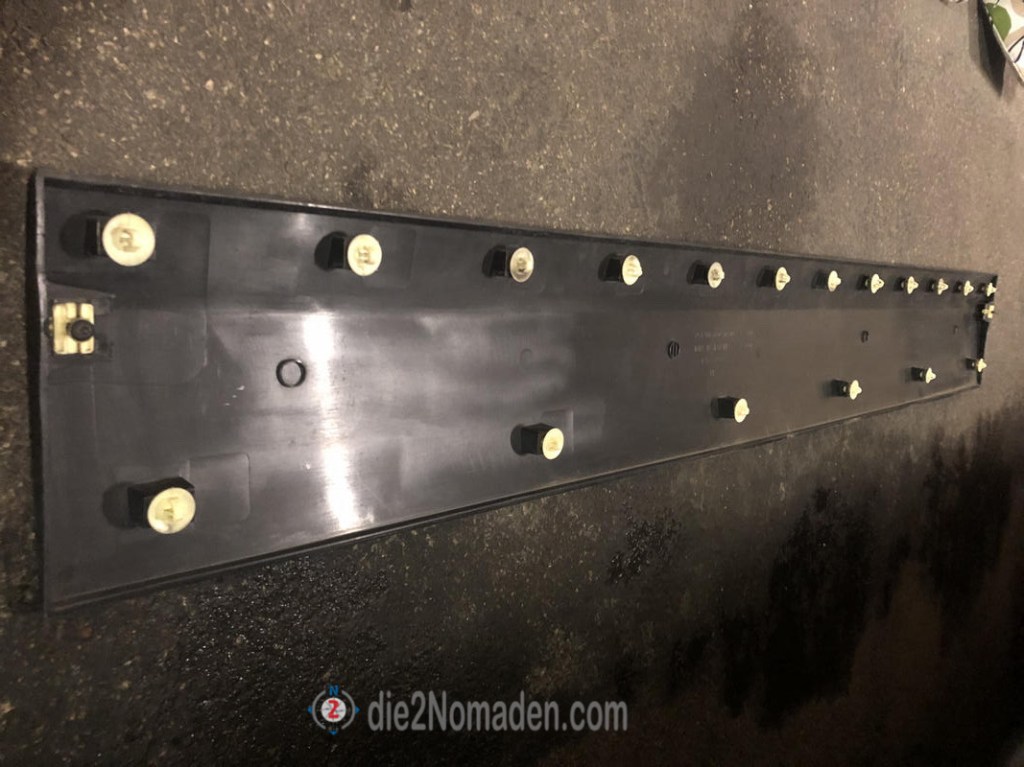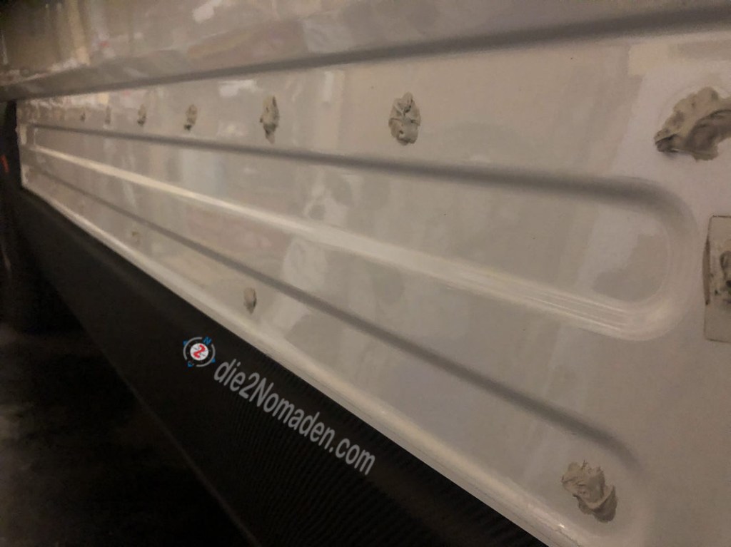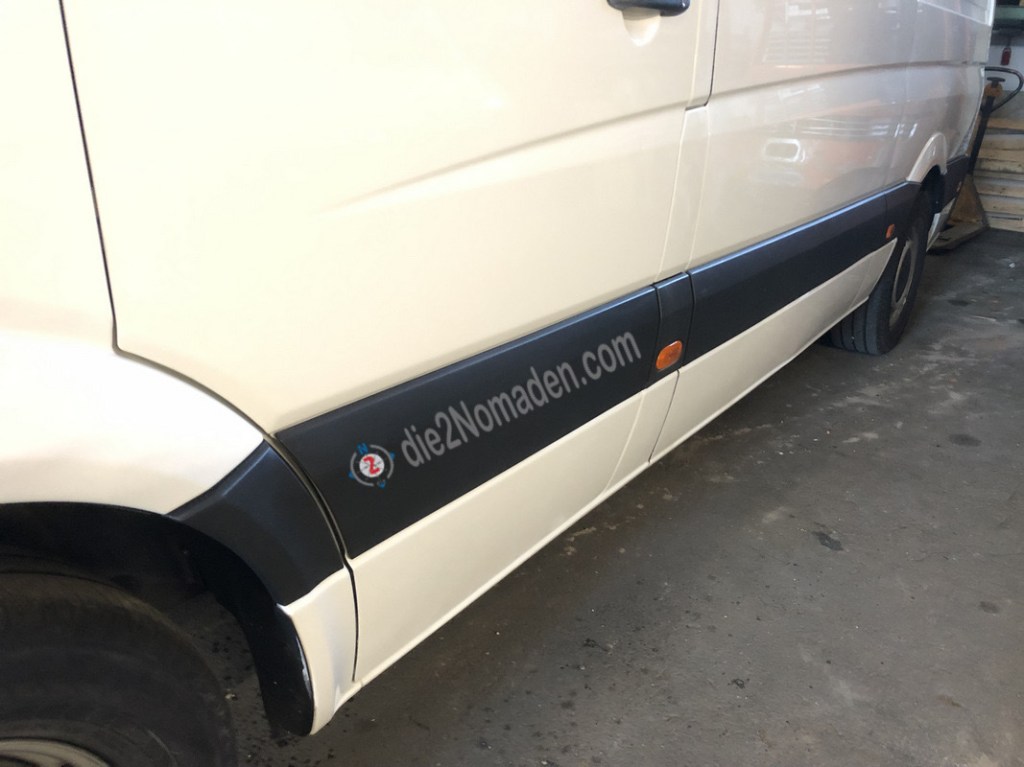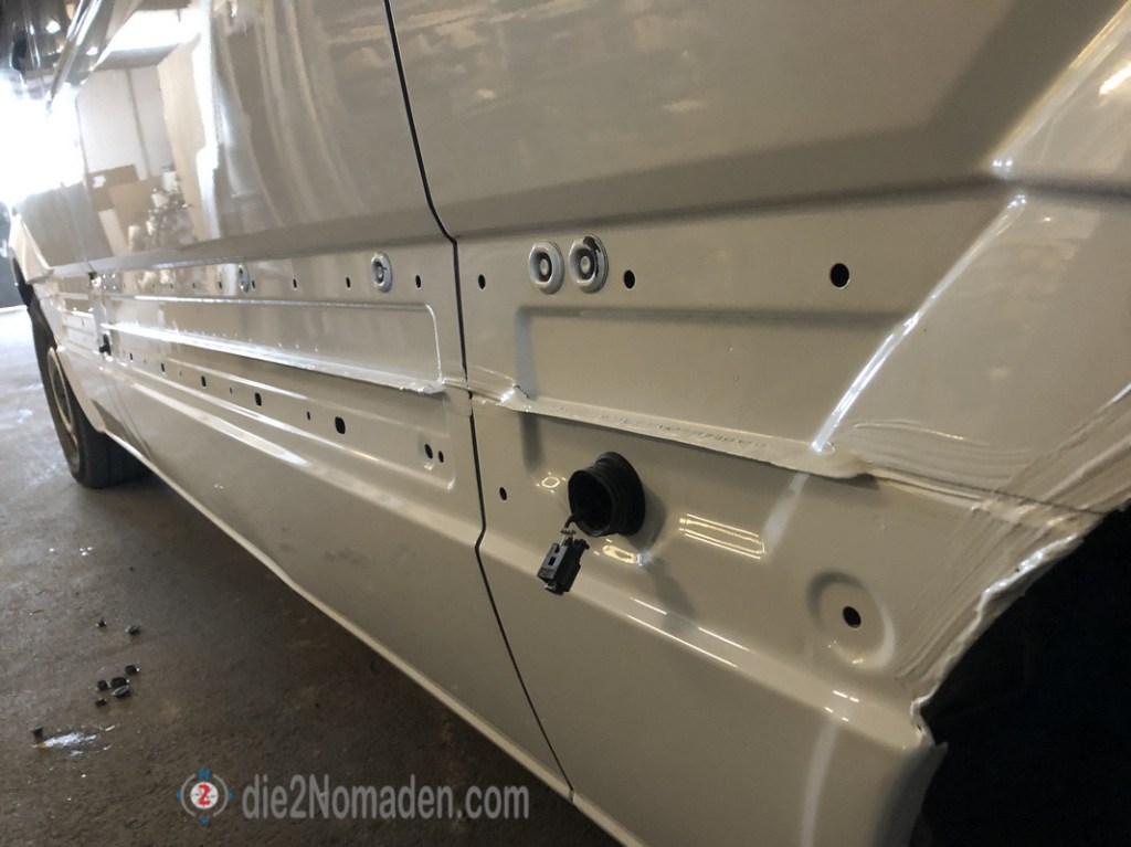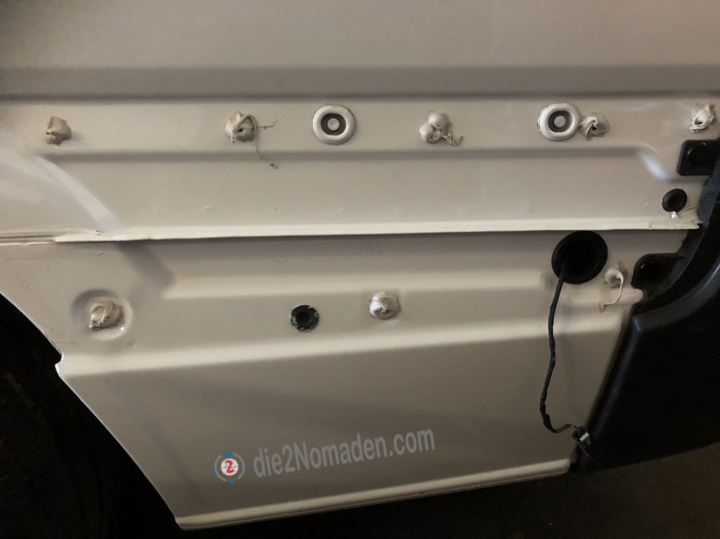 Nun haben wir die Klipse oder auch Befestigungspropfen aus den Verkleidungen bzw. auf den Öffnungen am Blech entfernt, den Lack unter der Seitenverkleidung des Sprinters vom Schmutz befreit und entfettet und die Klipse ebenfalls alle gereinigt. Sollten beim Abnehmen Klipse brechen, gibt es verschiedene Modelle zu kaufen.