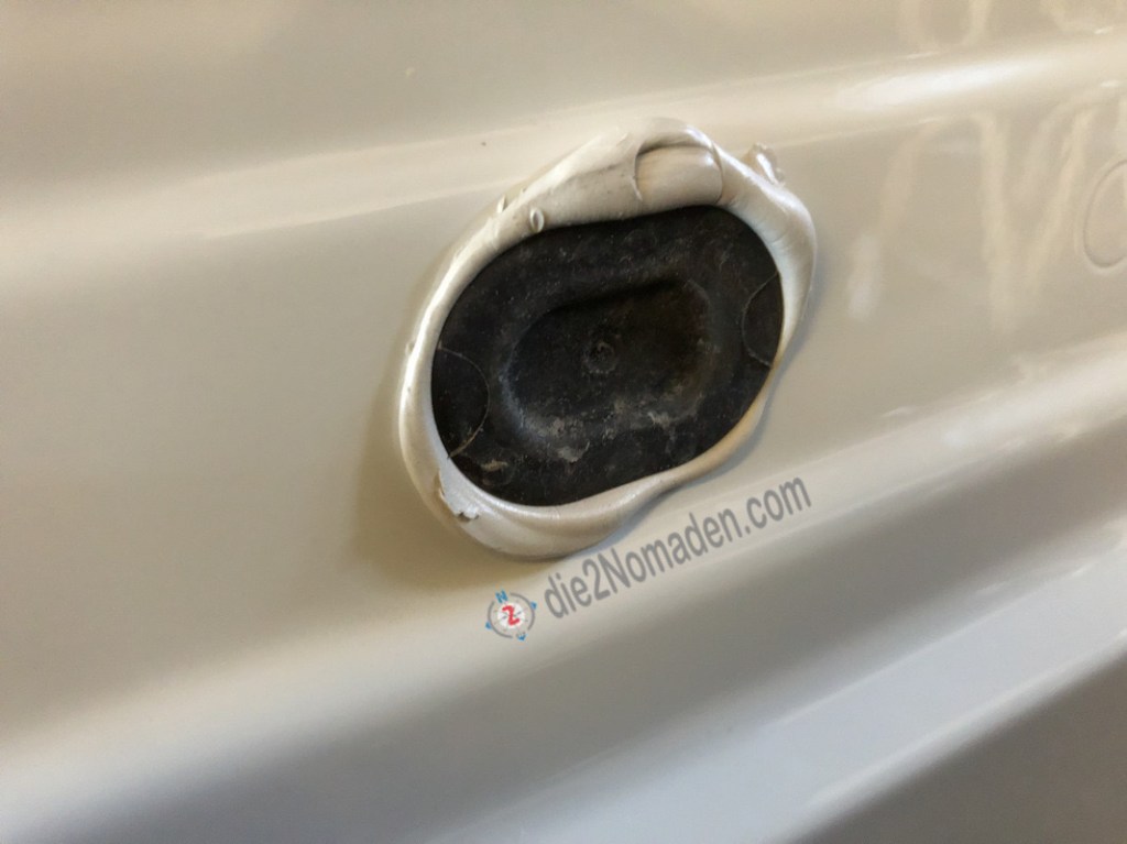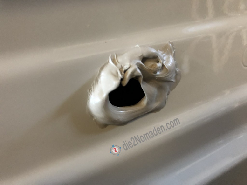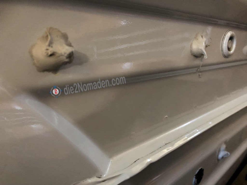 Weiters werden nun wieder alle Dichtpropfen mit der dauerelastischen Dichtmasse Dekasil 8936 eingeklebt und die Löcher für die Aufnahme der Klipse mit der Dichtmasse gefüllt.