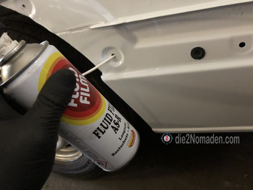 Da wir nun problemlos zu den Öffnungen im Blech kamen, haben wir pro Seite zwei Dosen Fluid Film, das ist ein Hohlraumschutz, eingesprüht.