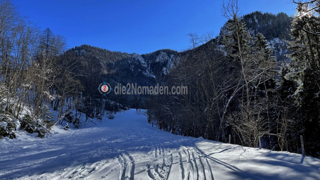 Langsam stapfe ich mit den Schiern den ersten Hang bis zur Forststraße hoch. Hinter einem 3er-Team nachmarschierend merke ich, dass meine Kondition für diese Art der Bewegung und die Geschwindigkeit der Gruppe nicht ausreichend ist.