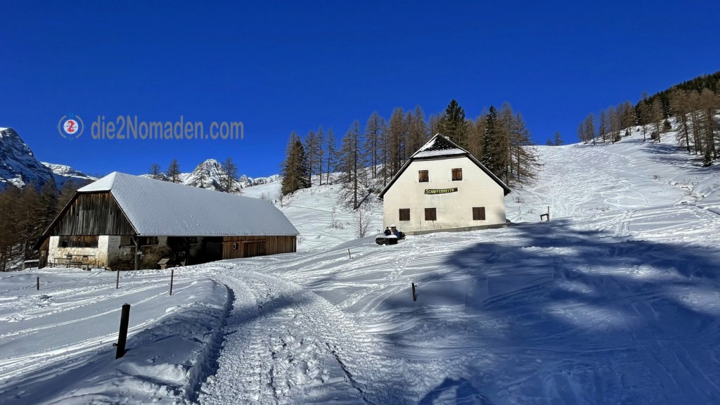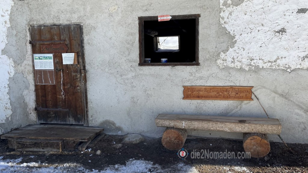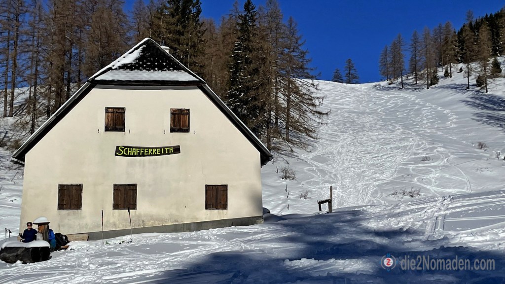 Ich folge jedoch den Steigspuren der Tourengeher vor mir und gelange kurze Zeit später zu einem Steilstück. In meinem Tempo absolviere ich diesen Hang und erreiche das Almgebiet Schafferreith, wo sich schon einige Sonnenhungrige die vorhandenen Sitzplätze teilen.