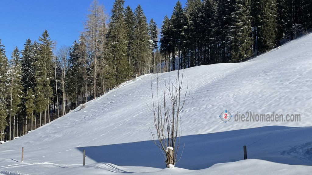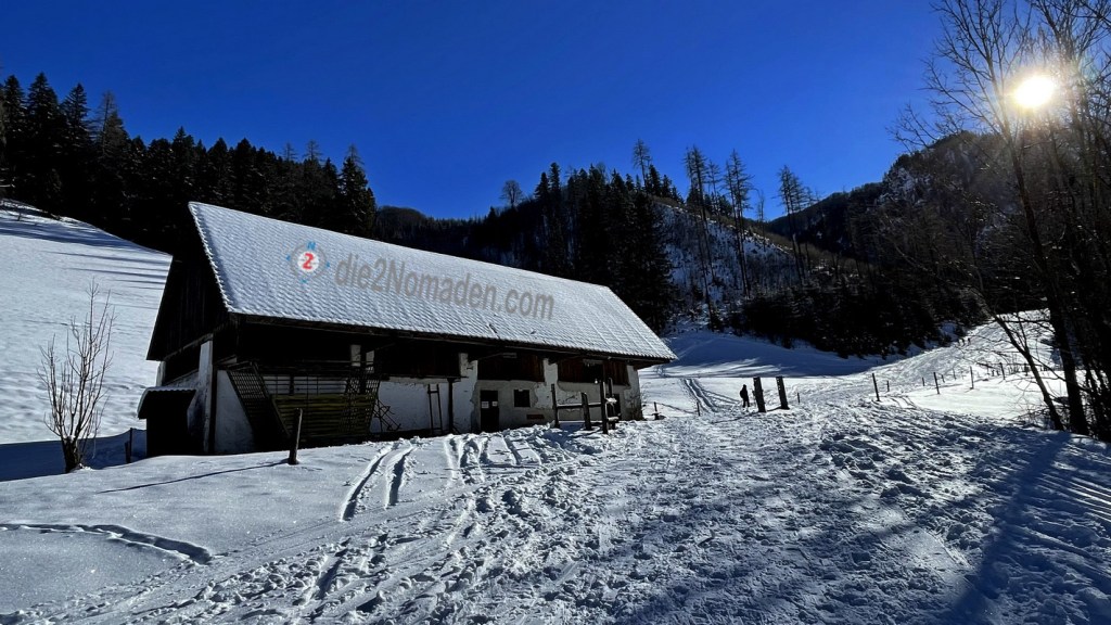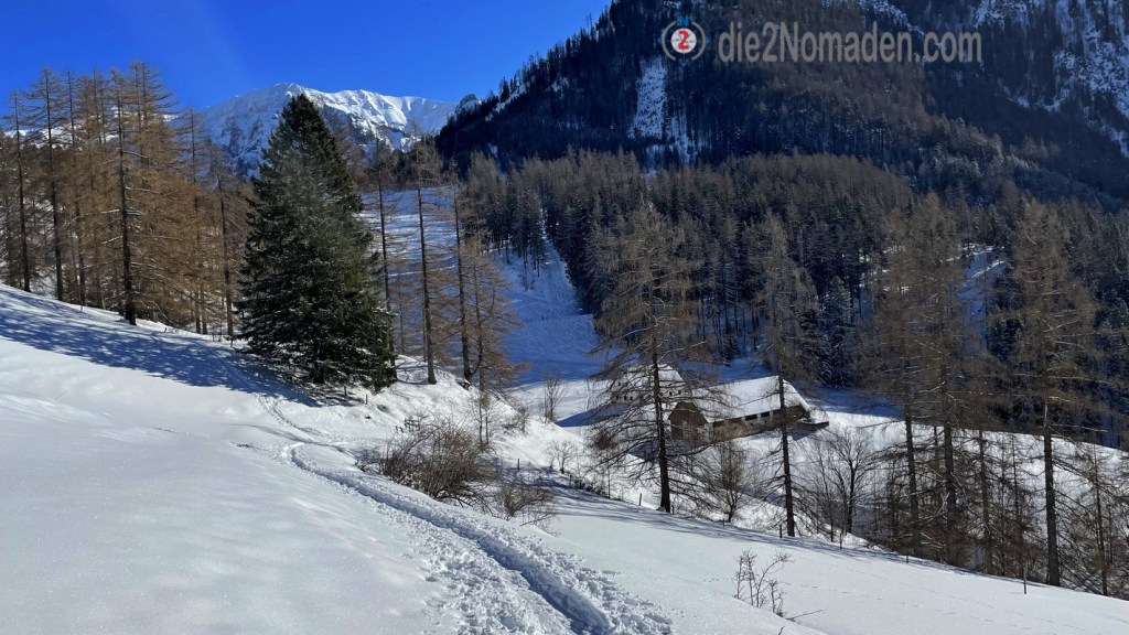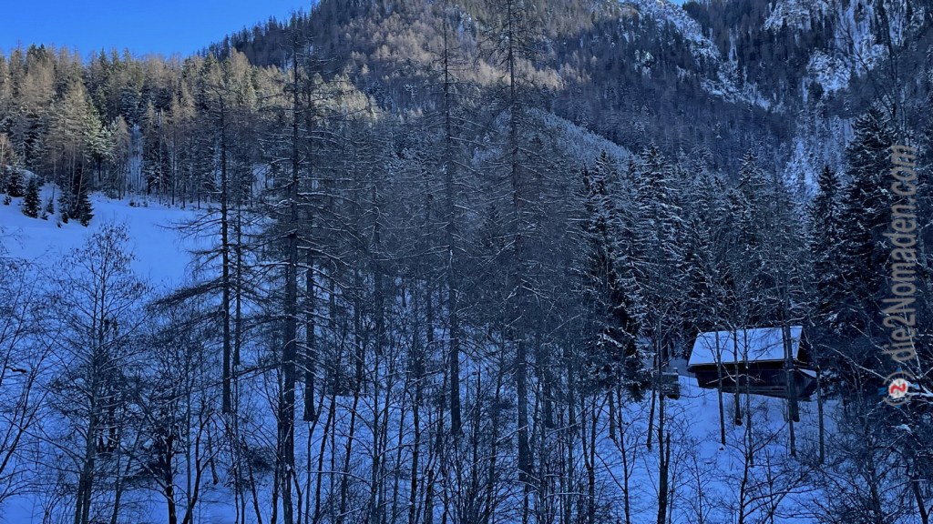 Eigentlich wollte ich eine Schneeschuhwanderung unternehmen, doch im Ortsgebiet machte ich Halt bei einem Verleiher von Wintersportgeräten, leiheh mir Tourenschi, Felle sowie Tourenschuhe aus und fahre zum Parkplatz des ehemaligen Schigebietes Bärenalm.