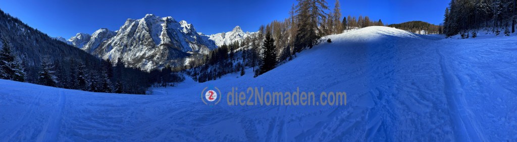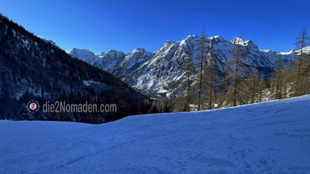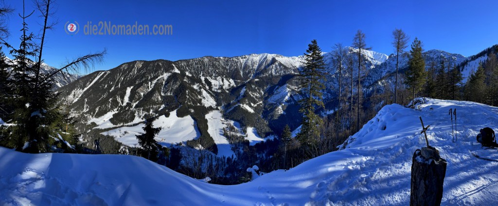 Nach einer weiteren kurzen Pause folge ich nun der Schneesschuhspur, welche sich links von Schafferreith den Hang entlang schlängelt. Beim Wendepunkt, an dem der Weg rechts nach oben weist, muss ich erneut stehen bleiben. Dieses Mal nicht um nach Luft zu schnappen, sondern um das beeindruckende Gebirgspanorama auf mich wirken zu lassen. Natürlich auch um einige Aufnahmen zu machen.