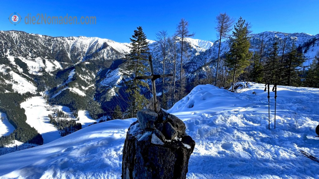 Um das kreative Gipfelkreuz sammeln sich ebenfalls einige Tourengeher.