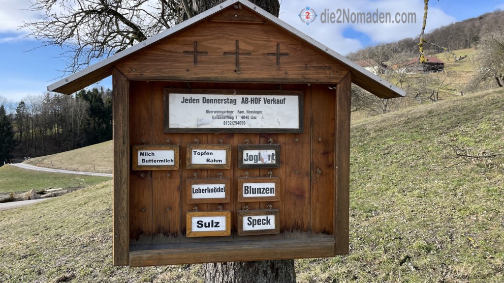 Etwa 800m weiter passieren wir den Hofladen oder genauer gesagt, das kleine Verkaufsstandl der Familie Hossinger. Hier gibt es allerlei selbstgemachte Produkte, wie Aufstriche, Würste, Speck, usw.