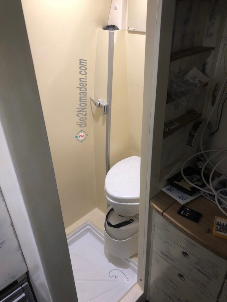 Da die Duschwanne 10 cm tief ist und die Toilette am oberen Rand steht, wir nicht unbedingt zu den Riesen gehört, pendeln unsere Beine während der Sitzung über der Duschwanne.