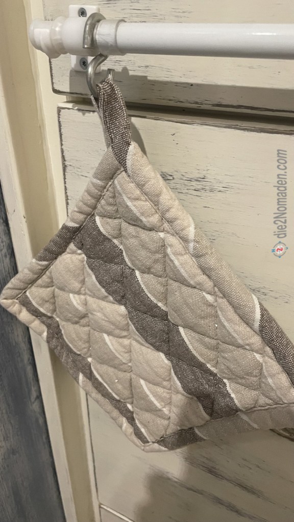 An der kürzeren Stange haben wir auch noch einen Universal-Haken gebogen und eingehängt. So kann nun auch unser Topflappen reisesicher aufgehängt werden.